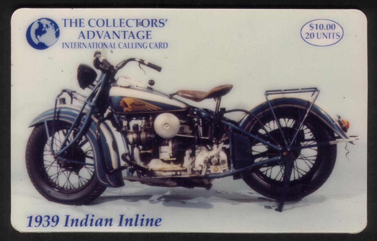 This collectible international calling card from The Collectors' Advantage features a detailed image of a 1939 Indian Inline motorcycle. The motorcycle is depicted in full profile against a white background, emphasizing its classic design and mechanical components. The motorcycle shows the characteristic features of the 1939 Indian Inline model, including the inline engine placement and vintage frame structure. The motorcycle seat is positioned prominently, and the overall styling reflects the era’s engineering and aesthetic.