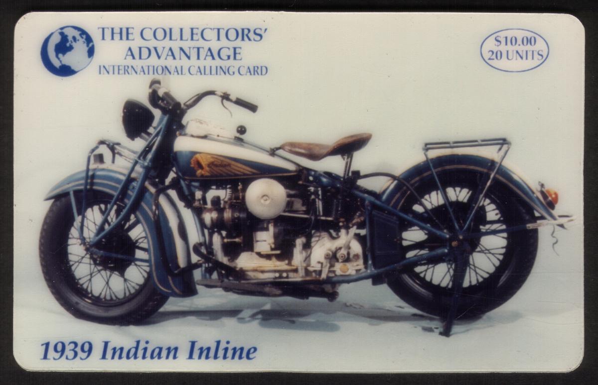 The top left corner of the card states "THE COLLECTORS' ADVANTAGE INTERNATIONAL CALLING CARD" alongside a blue globe icon. The top right corner includes a blue oval with the text "$10.00 20 UNITS." At the bottom left, the card reads "1939 Indian Inline" in blue script font.