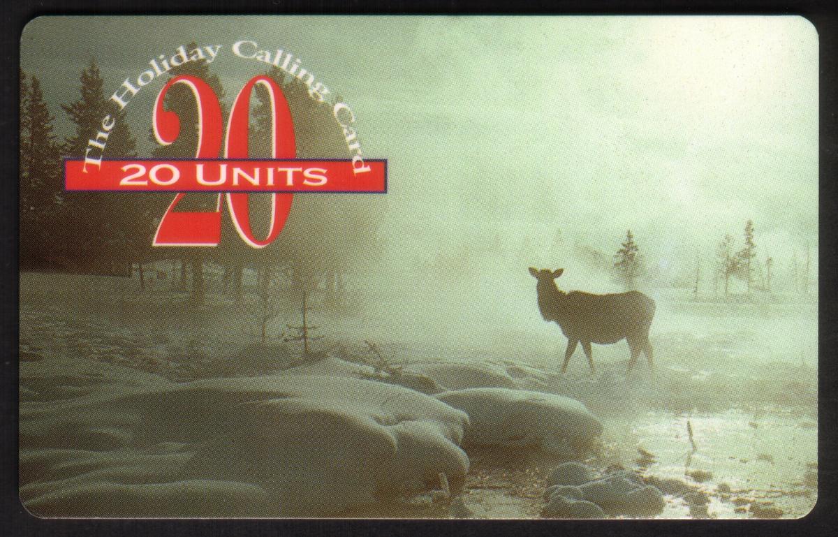 This collectible phone card titled "The Holiday Calling Card" features a winter forest scene with a moose standing in misty surroundings. The image captures a snowy landscape with trees visible in the background, partially obscured by fog or mist, evoking a quiet, wintry atmosphere. The moose is prominently positioned on the right side, facing left, with its silhouette clearly visible against the mist.