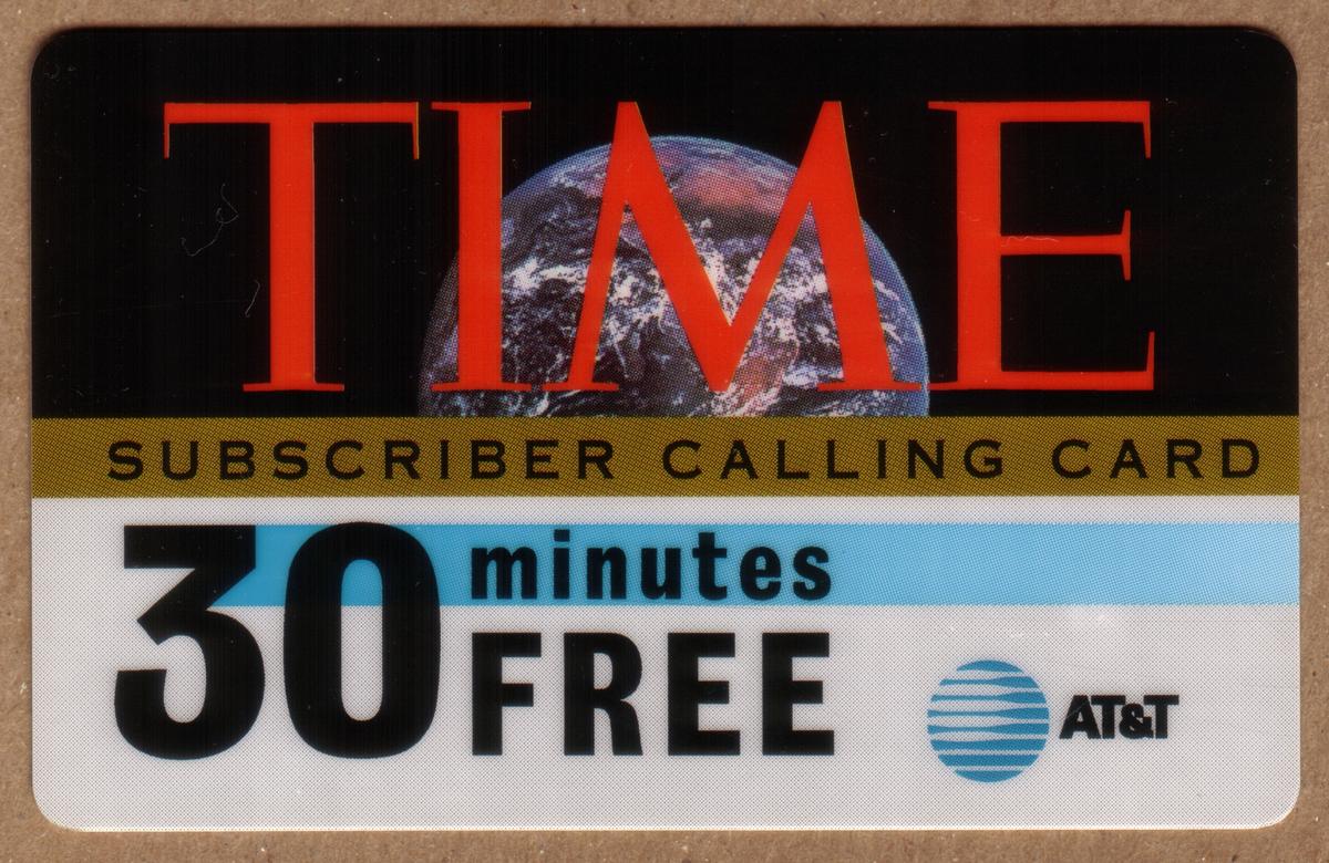 The bottom right corner of the card displays the AT&T corporate logo, consisting of blue horizontal stripes forming a globe shape, alongside the text "AT&T" in black. The card emphasizes the promotional nature of a free 30-minute calling credit for TIME magazine subscribers through AT&T. The design uses a clean, simple layout with strong branding from both TIME magazine and AT&T, clearly indicating a collaboration between the two corporations for this promotional calling card specimen.