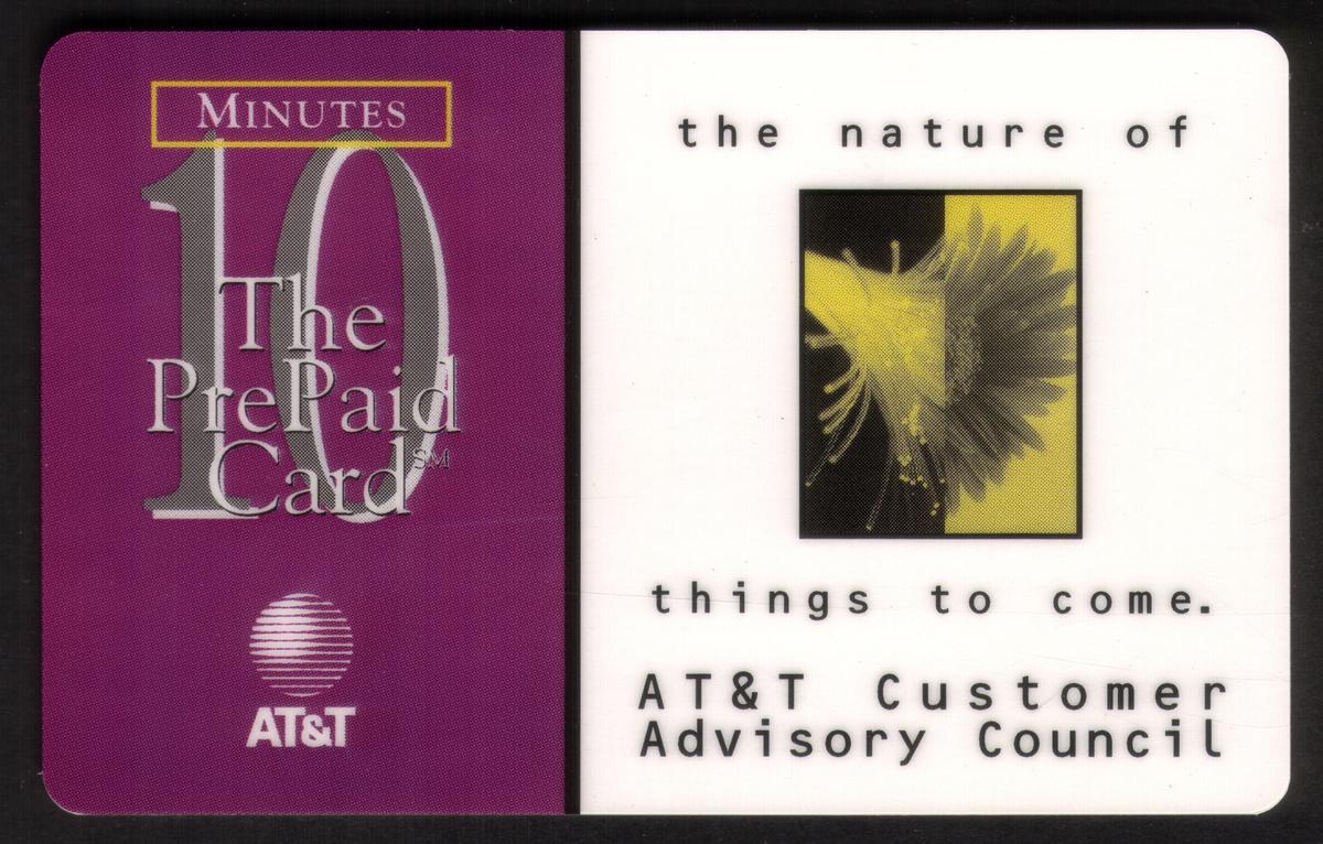 The card combines functional prepaid calling information with a thematic focus on nature and future progress. The emphasis on fiber optics and AT&T’s advisory council highlights this as a promotional collectible item related to technological and customer communication advancements.