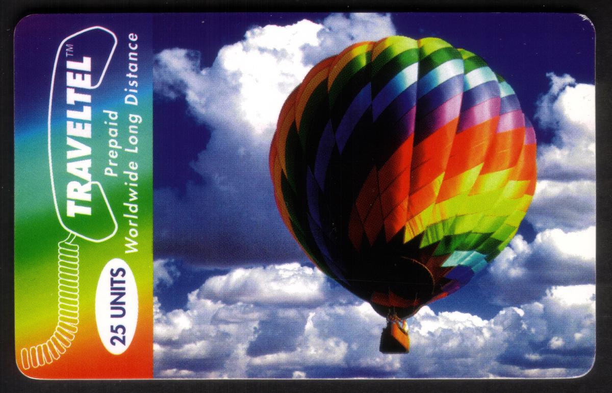 This collectible TravelTel phone card features a vibrant image of a hot air balloon in mid-flight against a backdrop of a cloudy sky. The balloon is illustrated with bright, multicolored panels that include red, green, yellow, and white sections, creating a striking and cheerful appearance. The scene captures the balloon floating peacefully through the clouds, evoking themes of travel and adventure.