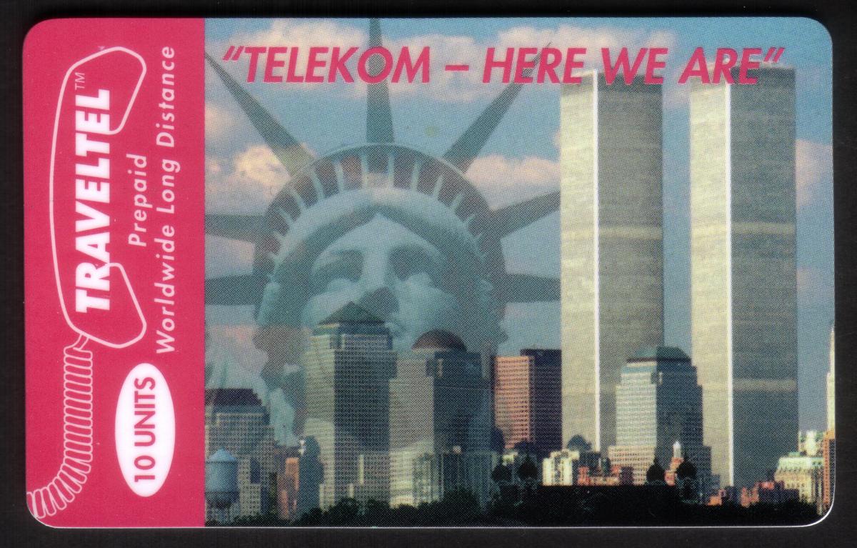 Overall, the card combines significant New York City landmarks with telecommunications branding, capturing a moment in time with the Twin Towers still standing. The imagery, logos, and text all reflect its purpose as a collectible phone card connected to Deutsche Telekom and TravelTel.