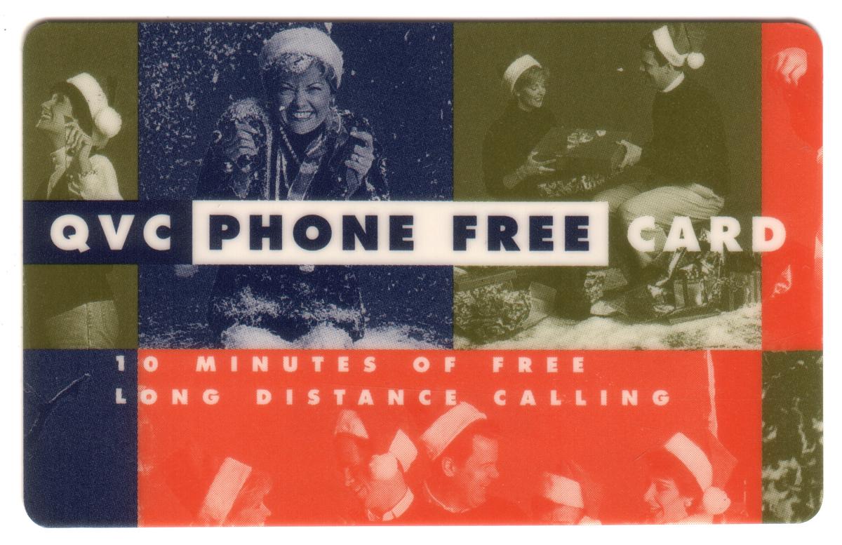 This collectible phone card is a promotional QVC Phone Free Card offering 10 minutes of free long-distance calling. The card prominently displays the "QVC PHONE FREE CARD" text in bold, white uppercase letters across the center. Below this text, in smaller white uppercase letters against a red background, it states "10 MINUTES OF FREE LONG DISTANCE CALLING."