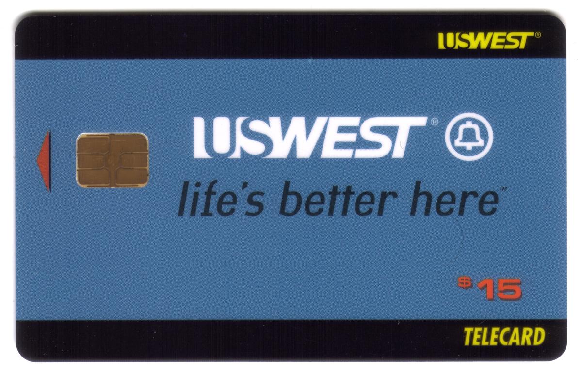 This collectible chip card features the U.S. West $15 Life's Better Here design, marked as Chip Card #1 out of 15 from U.S. West Communications. The card prominently displays the "Life's Better Here" slogan in bold letters on the left side, along with the U.S. West Communications name and logo positioned on the bottom right. The overall design is simple and clean, using a blue and white color scheme.