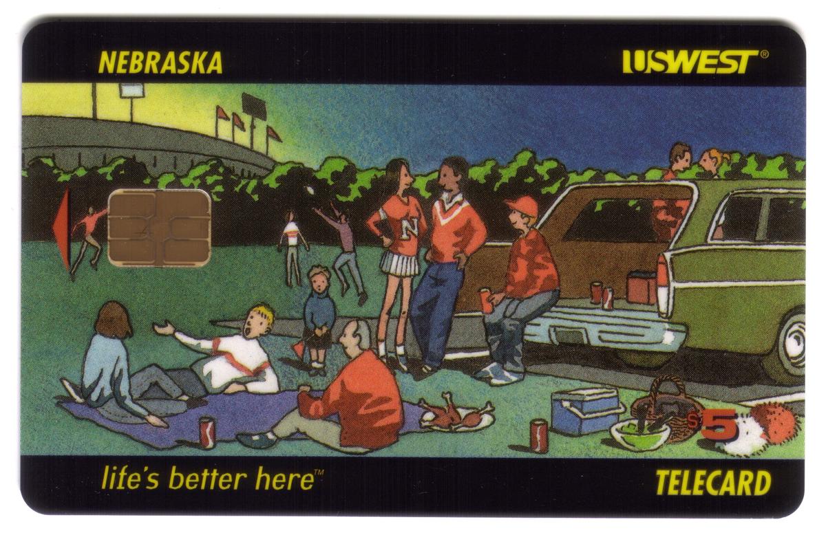 The card prominently displays the phrase "Life's Better Here - Nebraska," associating the theme with the state of Nebraska and its football culture. The sports theme centers on football, conveying the social and celebratory aspects of the sport through the tailgate setting. The U.S. West Communications logo is present, indicating its origin and connection to U.S. West.