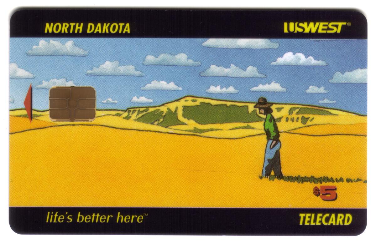 The card displays the denomination "$5" prominently, along with the phrase "Life's Better Here - North Dakota." These elements highlight the card’s theme centered on the state of North Dakota and suggest an appreciation for the quality of life found there. The card is titled "U.S. West Commun." and is identified as Chip Card #10 out of a series of 15 cards.