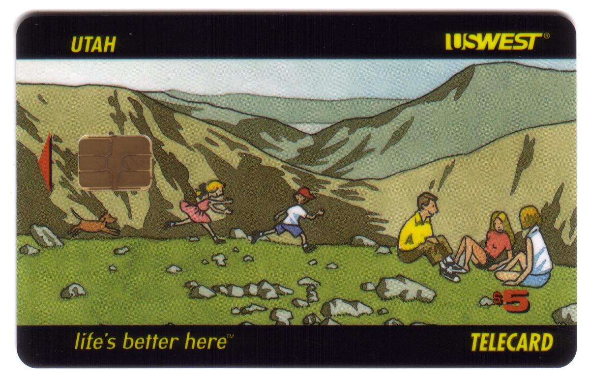 Text on the card confirms its association with U.S. West, providing context for the design's origin. The composition balances natural elements with human and animal presence, creating an inviting and lively visual narrative that emphasizes enjoyment of outdoor family time in Utah.