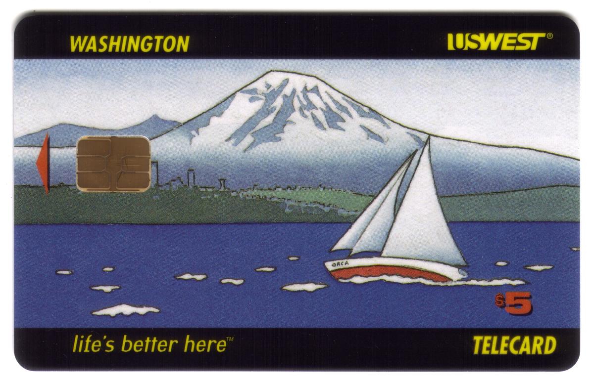 Text on the card includes "$5" indicating its value, along with the phrase "Life's Better Here - Washington State." The card is part of a series identified as Chip Card #14/15 from U.S. West Communications. The U.S. West logo is present, reinforcing the connection to the telecommunications company. The card celebrates the outdoor lifestyle and recreational boating commonly associated with Washington State.
