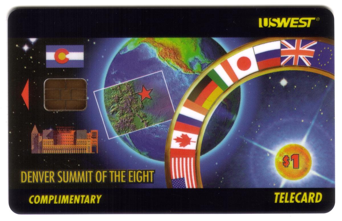 This chip card is an original packaged piece linked directly to the U.S. West Communications company and the G-8 Economic Summit, making it a notable collector’s item. It embodies the intersection of technology, business, and international cooperation through the G-8 Summit theme.