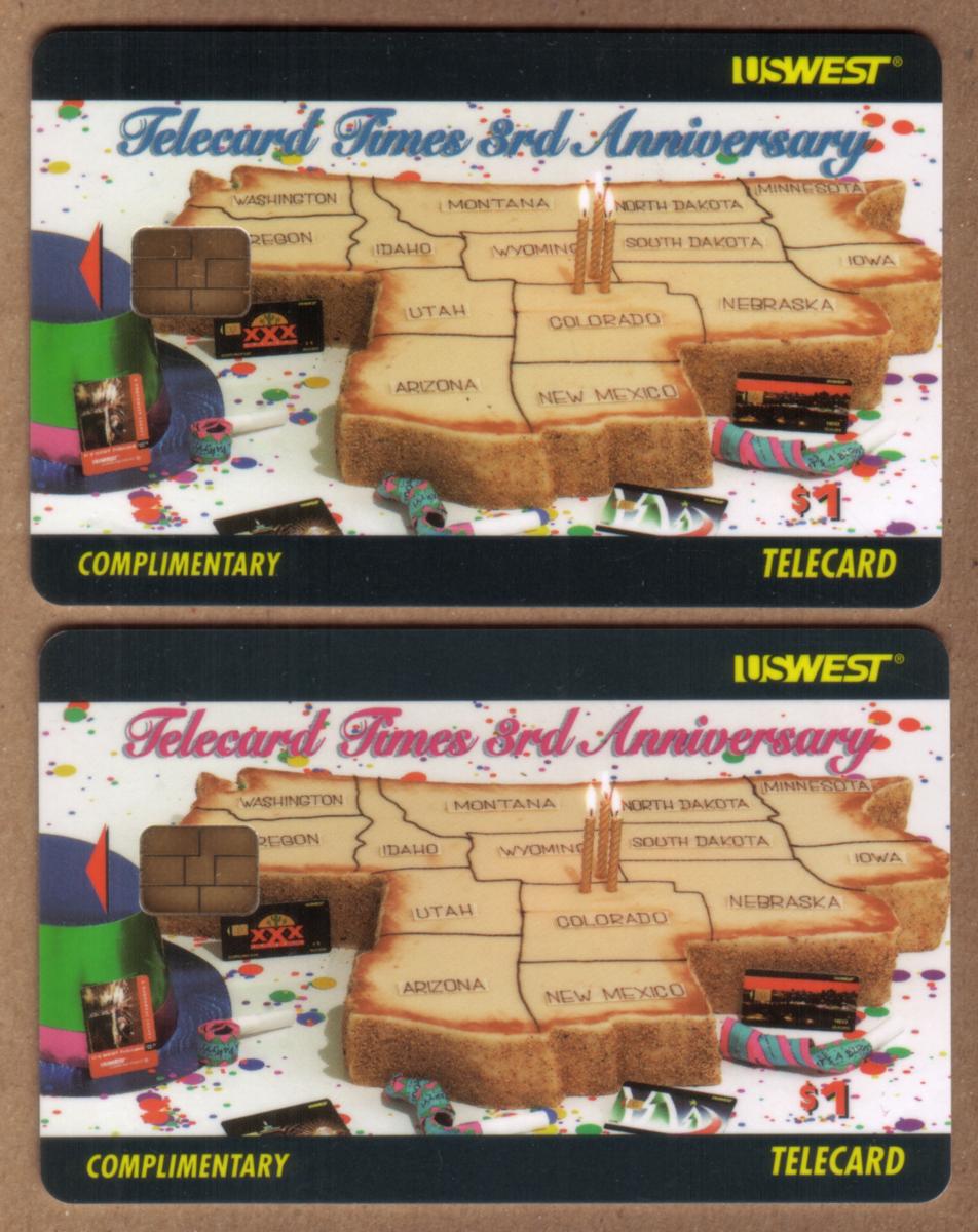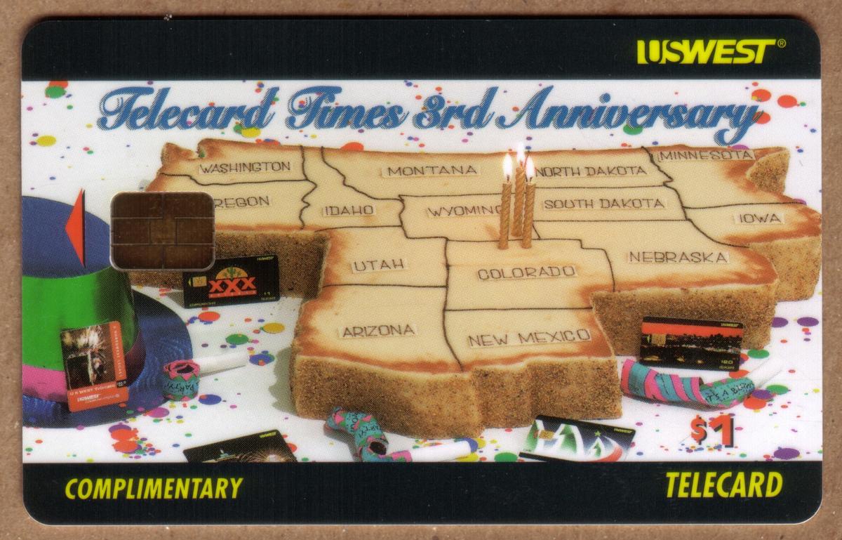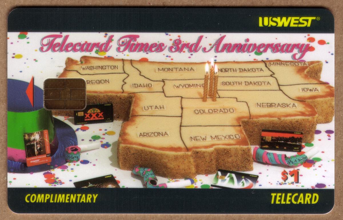 The top of the card displays the text "Telecard Times 3rd Anniversary" in a cursive font, colored blue on one card and red on the other. Along the bottom edge, the words "COMPLIMENTARY" and "TELECARD" appear in yellow block letters on a black band. The card’s stored value is $1 as printed near the candles on the sandwich. This chip card clearly commemorates the third anniversary of Telecard Times, promoted by U.S. West Communications.