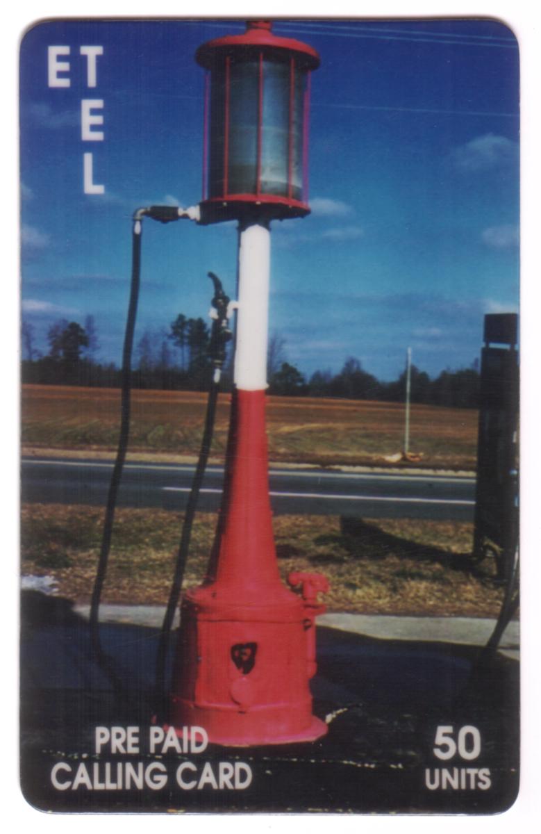 The phone card is issued by E.T. Tel Communications and represents prepaid units for calling. The overall image provides a nostalgic artistic depiction of vintage gas pump equipment in a rural or semi-rural roadside setting.
