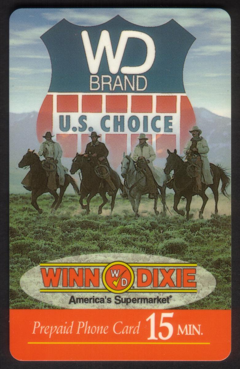 Prominently displayed on the card are corporate logos and trademarks, including "Winn-Dixie" and the phrase "America's Supermarket," linking the imagery to the Winn-Dixie brand. The card also includes the text "15m WD Brand U.S. Choice Beef," highlighting a promotional connection to a branded beef product from Winn-Dixie. The telecommunications company ConQuest is identified as the issuer, as seen by the "ConQuest Telecommun." label on the card.