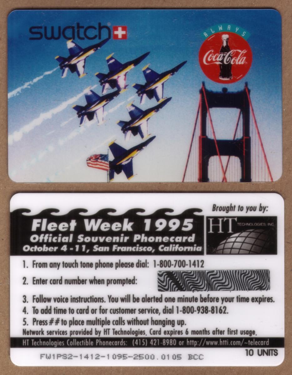 Collectible phone card honoring 1995 San Francisco Navy Fleet Week featuring Blue Angels jets, Golden Gate Bridge, American flag, Coca-Cola, and Swatch logos. |