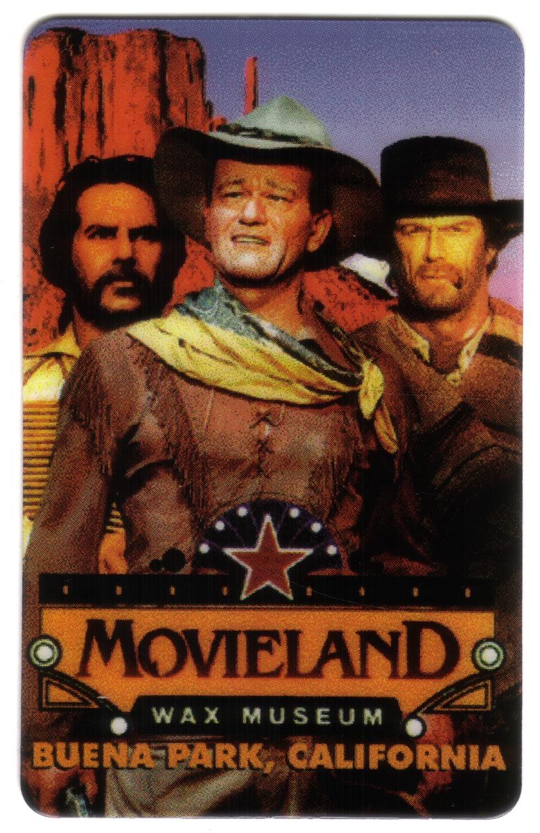 The card displays the Movieland Wax Museum logo and clearly includes the name John Wayne, who is a legendary Hollywood actor recognized for his roles in Western films. Other celebrities or figures are mentioned but not individually named on the card. The design incorporates branding from HT Technologies and references WorldCom in the lower portion of the card, indicating associations with these companies.