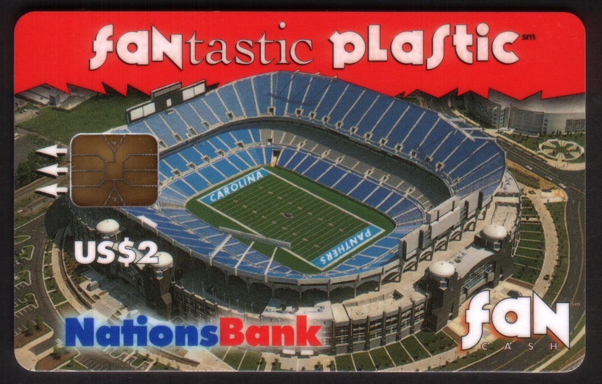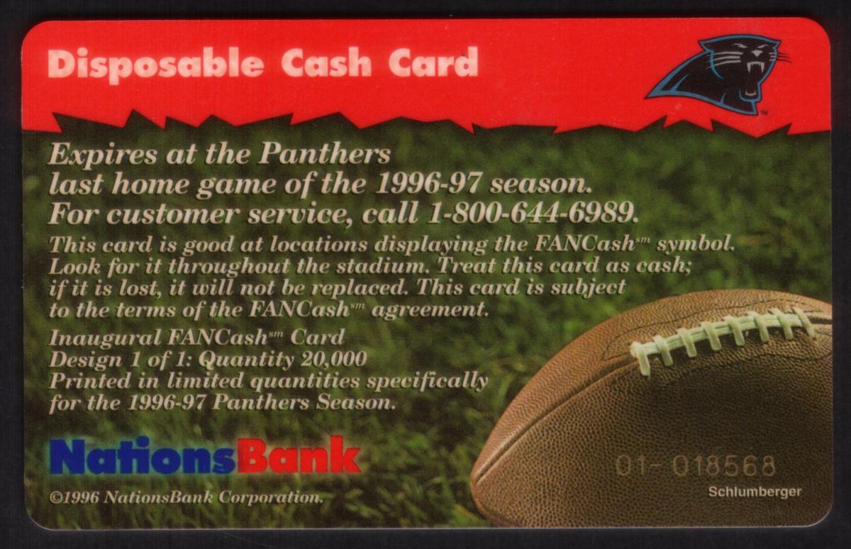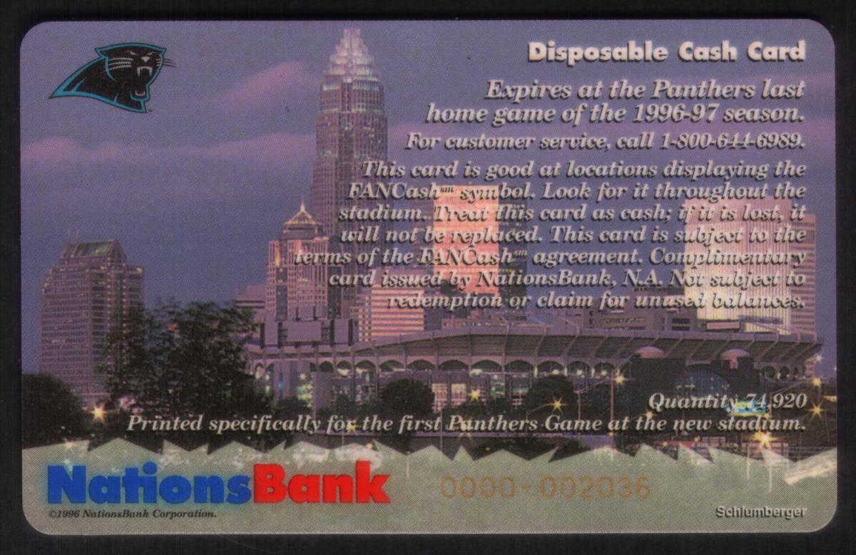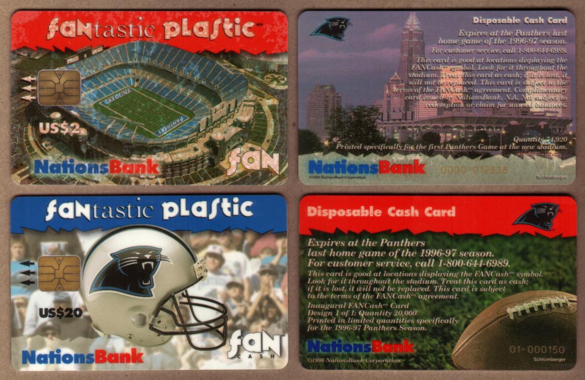 The design and artwork emphasize the association with the NFL team Carolina Panthers and its home venue, Ericsson Stadium, symbolizing the 1996-1997 season. The cards are part of a sports-themed series related to the Olympics and football, with clear branding from the issuing bank, NationsBank. The colors and graphics provide a vivid representation of the NFL football culture during that period.