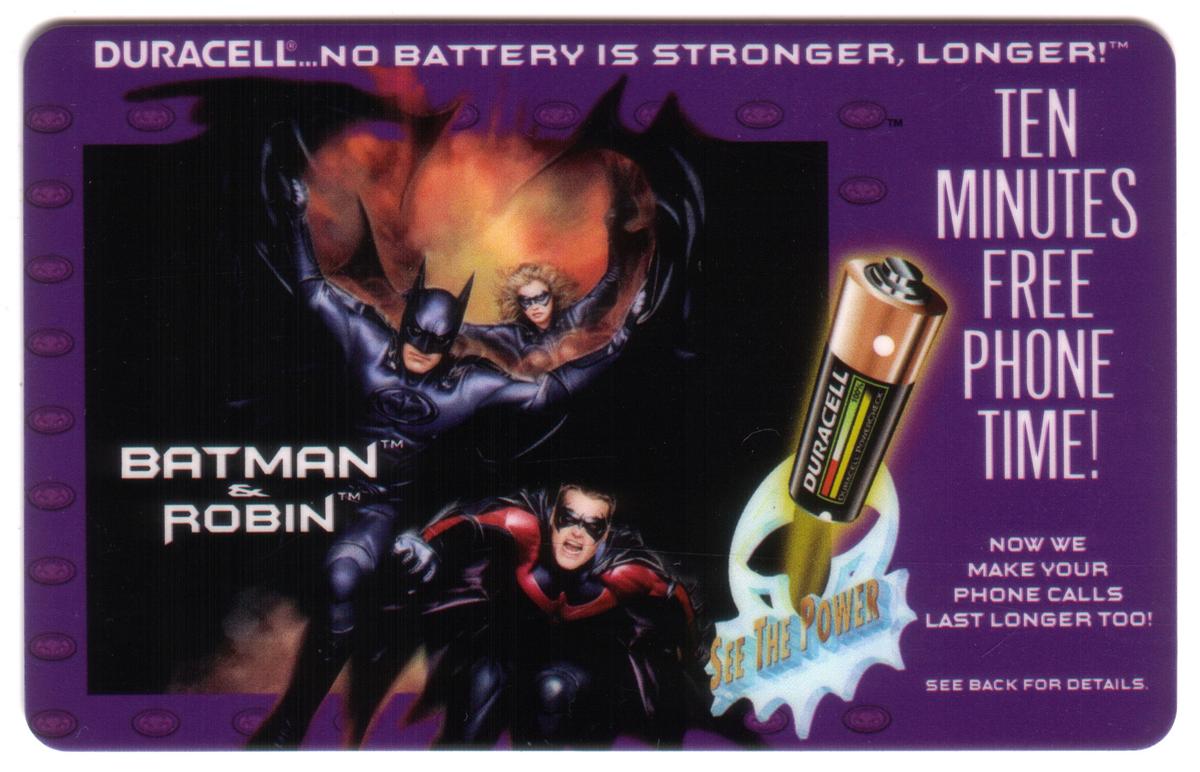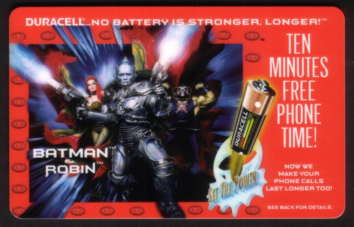 Each card promotes Duracell's batteries by giving "TEN MINUTES FREE PHONE TIME!" and the slogan "No battery is stronger, longer!" These promotional phone cards connect the power and longevity of Duracell batteries with the strength and heroism of the "Batman & Robin" movie characters. They were produced by MCI Telecommun. Corp. and highlight a collaboration between Hollywood, superheroes, and battery branding.
