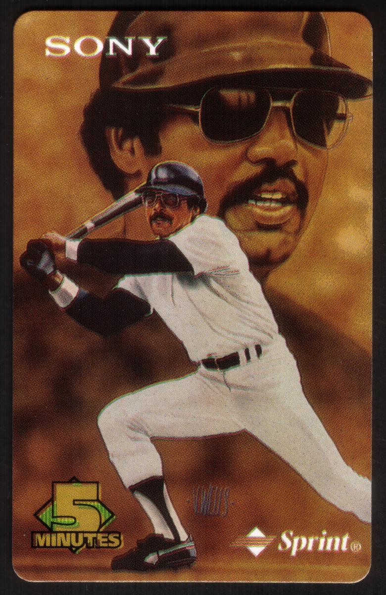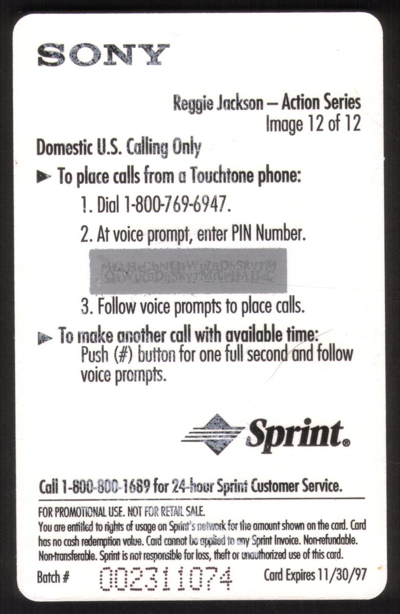 The card honors Reggie Jackson’s legacy as a baseball icon and is a collectible item for sports memorabilia enthusiasts. It blends detailed player imagery with corporate logos, clearly highlighting the collaboration between Sony and Sprint for this limited edition release.