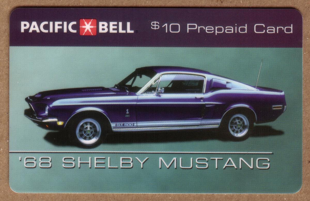 At the top of the card, a wide purple banner displays the Pacific Bell logo, consisting of the text "PACIFIC BELL" alongside a red star symbol, followed by "$10 Prepaid Card" in white lettering. The overall design highlights the classic car's sleek and muscular form, celebrating automotive heritage, specifically the 1968 Shelby Mustang model.