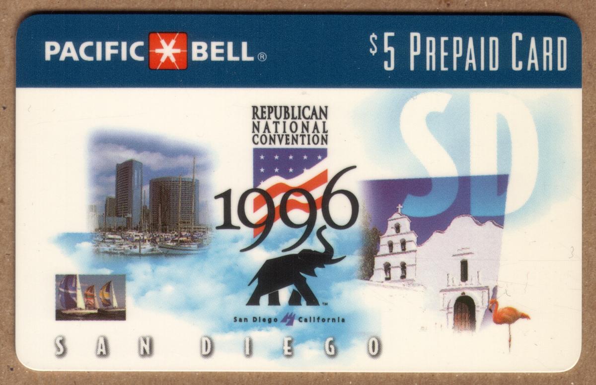 $5 Pacific Bell prepaid card featuring 1996 Republican National Convention imagery, San Diego harbor, Spanish mission, and patriotic political symbols. |