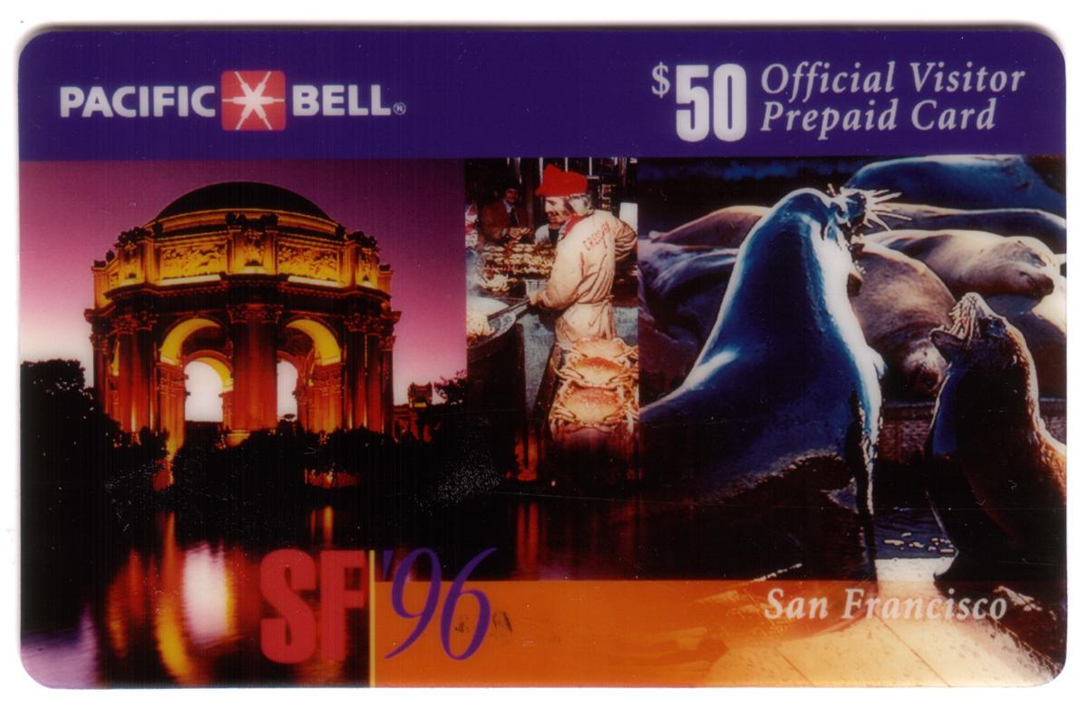 The card displays “SF ‘96” in bold letters at the bottom center, indicating the year 1996. “San Francisco” is scripted in white at the bottom right side, beneath the sea lions. The upper portion of the card has the Pacific Bell logo on the left, and "$50 Official Visitor Prepaid Card" printed in white on a purple background across the top.