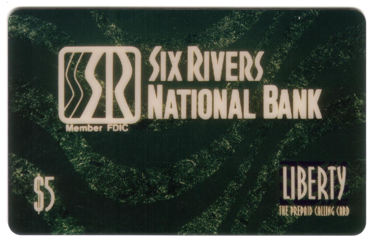 This collectible bank card features the logo and branding of Six Rivers National Bank. The card has a face value of $5 prominently displayed. The design incorporates the corporate trademarks of Six Rivers National Bank and Quest Group Internatl, suggesting an association between these financial institutions. The card’s visual elements include clean typography emphasizing the bank’s name and the monetary value, with a background that supports the corporate identity.