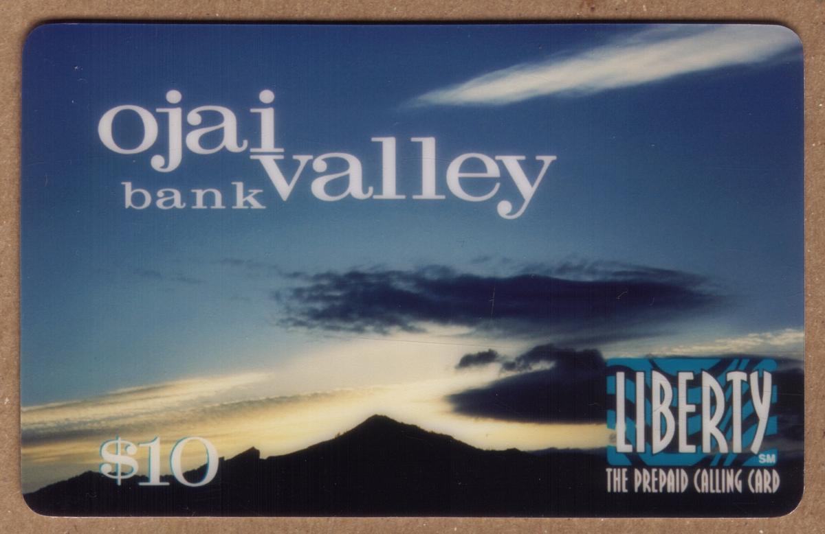 Ojai Valley Bank promotional card featuring scenic mountain twilight, $10 value, Liberty prepaid calling logo, symbolizing trust, stability, and community. |