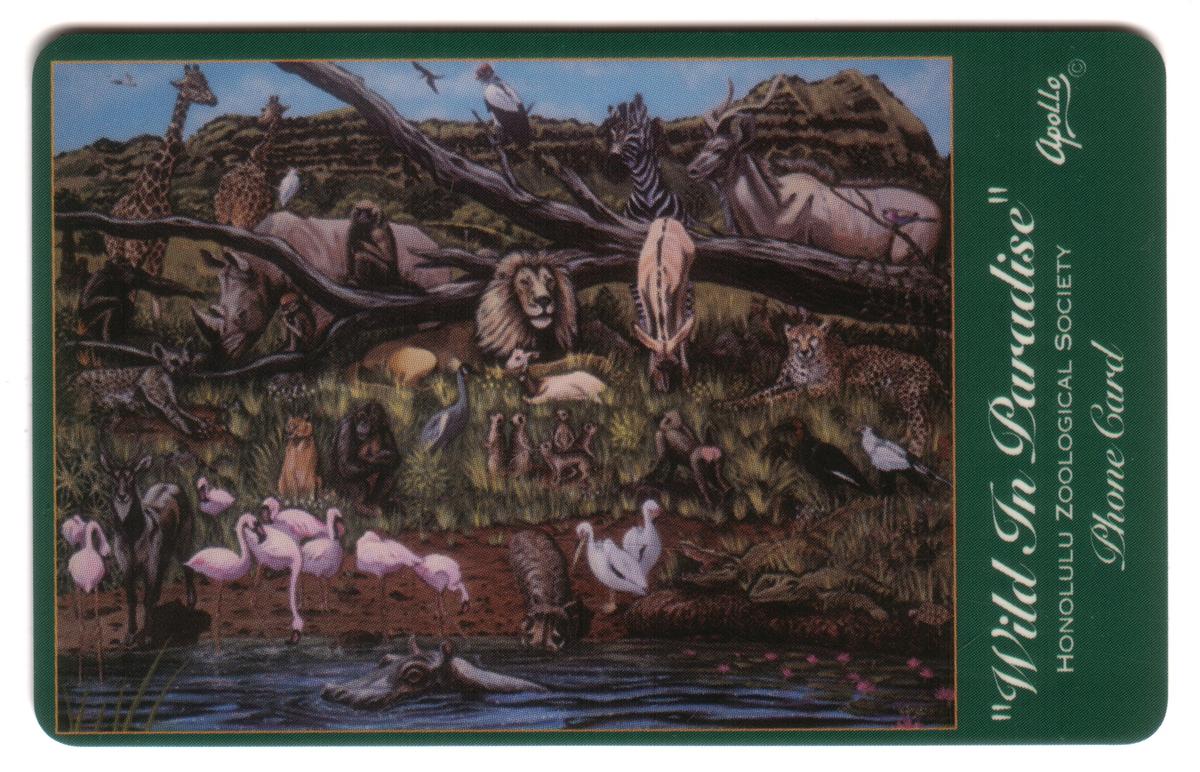 This collectible phone card features vibrant artwork titled "Wild In Paradise" created by Apollo, associated with the Honolulu Zoological Society (HZS). The design showcases a vivid assortment of exotic animals in a naturalistic setting, including flamingos, lions, zebras, monkeys, giraffes, tigers, and baboons. These animals are depicted with colorful details, giving a dynamic and lively impression of a wildlife scene, emphasizing the theme of artistic conquest long distance calls.