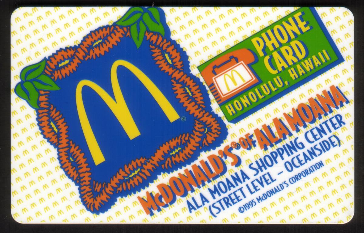Hawaiian-themed McDonald’s Ala Moana phone card featuring the golden arches, Hawaiian lei, and Honolulu location, combining branding with local culture. |