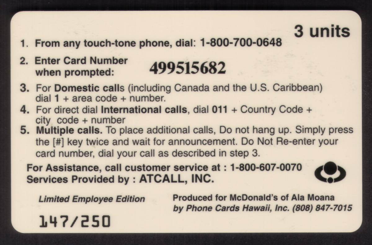 Keywords: McDonalds, McDonald's corporation, Hawaiian Islands, fast food chains, restaurants, telephones on phonecards, Golden Arches, logos, trademarks, ala moana shopping center, street level, oceanside, atcall inc, ekahi #1, Phonecards Hawaii