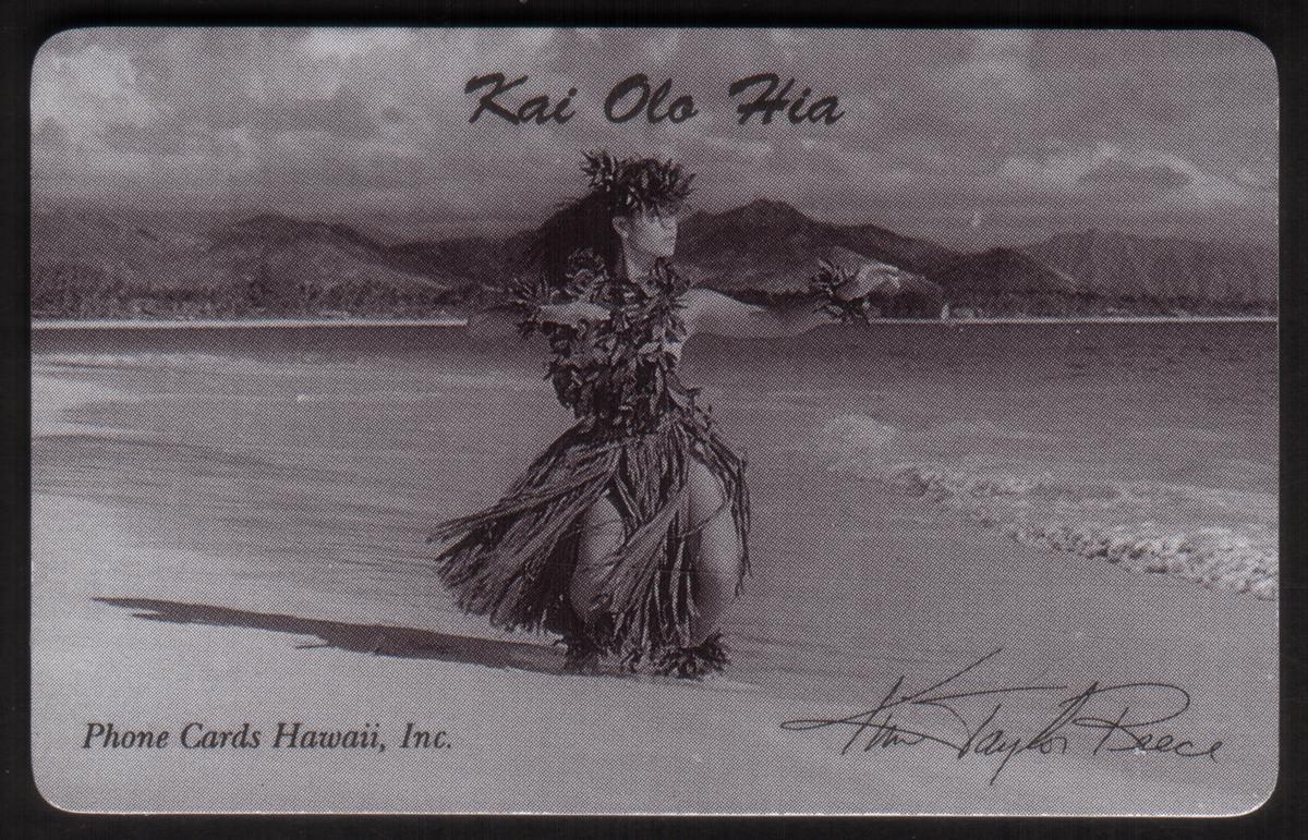 This collectible phone card features a black and white photographic image of a Hawaiian hula dancer named Kai Olo Hia. The photo was taken by Kim Taylor Reece and showcases the traditional movement and attire of the dancer, capturing the essence of Hawaiian culture through dance. The image is clear, offering a detailed view of the dancer in mid-performance.