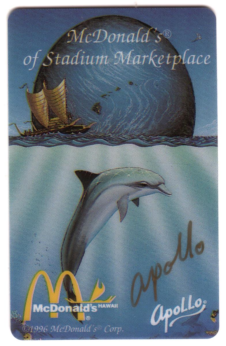 Hawaiian marine life themed card featuring a bottlenose dolphin, traditional sailing canoe, McDonald''s Hawaii logo, and artist Apollo''s signature. |