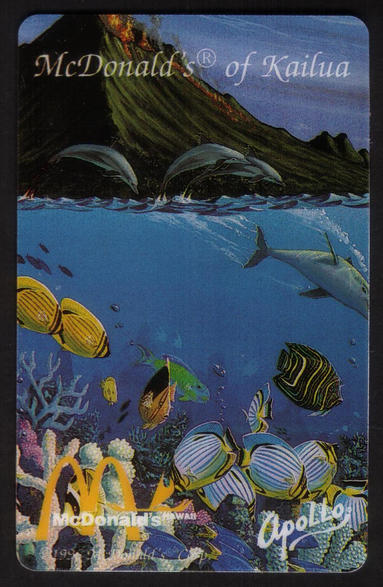 Hawaiian-themed phone card featuring Kailua''s volcanic landscape, playful dolphins, colorful reef fish, coral reefs, and McDonald''s branding. |