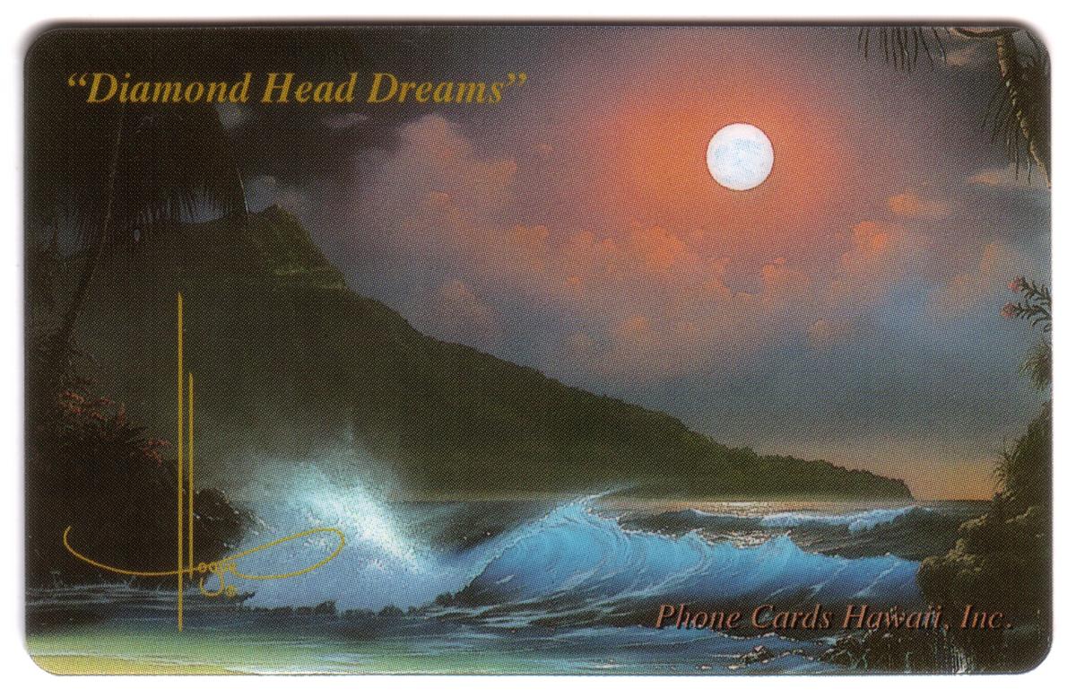This collectible phone card features the artwork titled "Diamond Head Dreams" by Al Hogue. The design showcases a vibrant sunset over a coastal scene where ocean waves meet the shoreline. In the foreground, stylized mountains rise alongside the sea, creating a tranquil and artistic representation of a Hawaiian landscape. The palette includes warm sunset hues blending with the blues of the ocean, offering a visually striking and serene atmosphere.