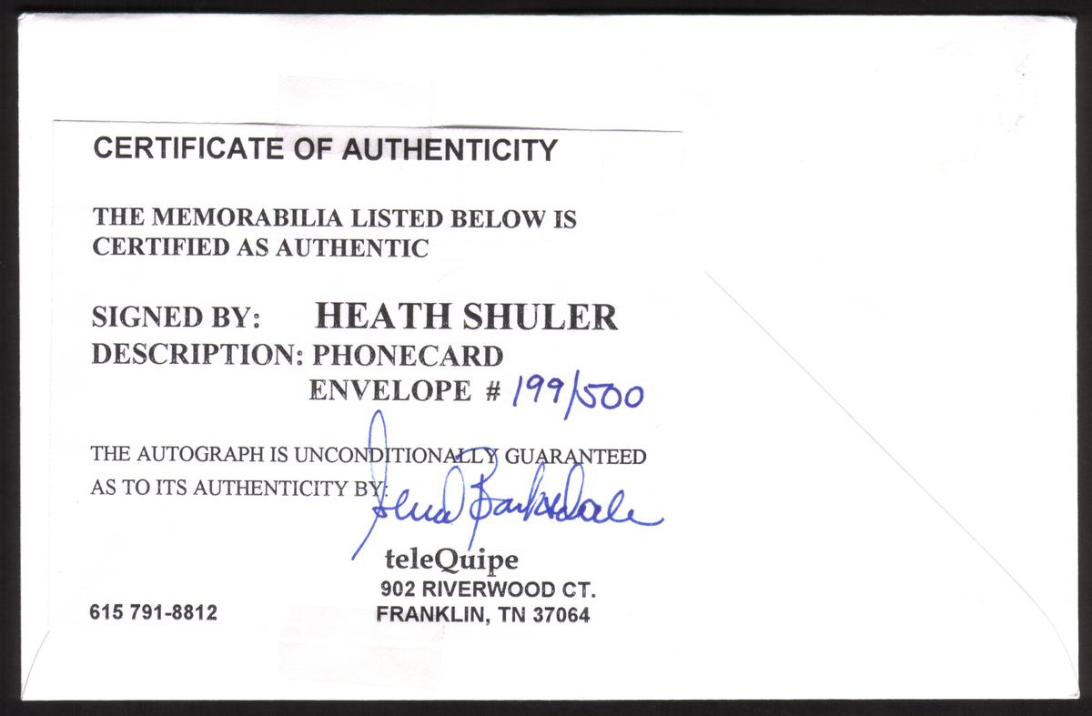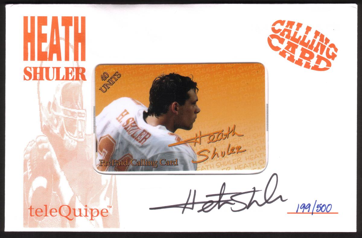 Visually, the cards combine team logos, player photographs, and professional design elements that celebrate Heath Shuler’s athletic achievements. The text on the cards names both teams—the Tennessee Volunteers and Washington Redskins—alongside branding from the involved marketing groups. This collectible set serves as a tribute to a distinguished football player, offering signed memorabilia for fans and collectors interested in sports history and football autographs.