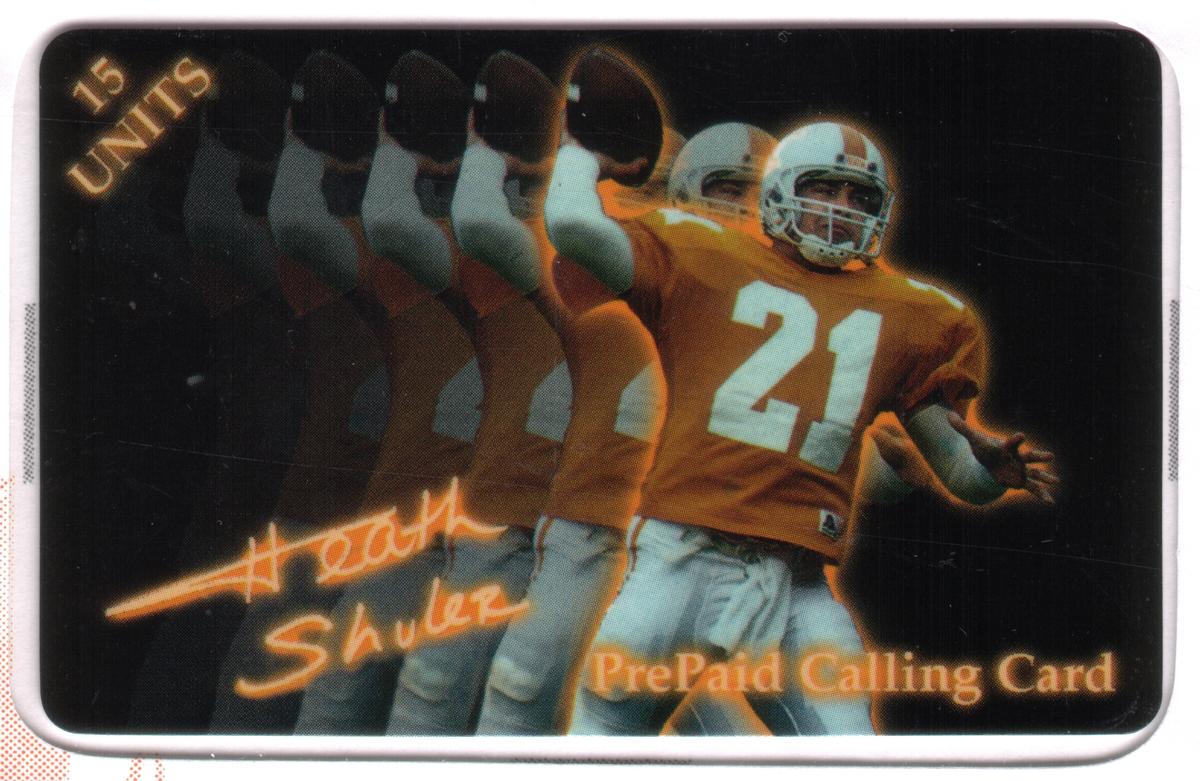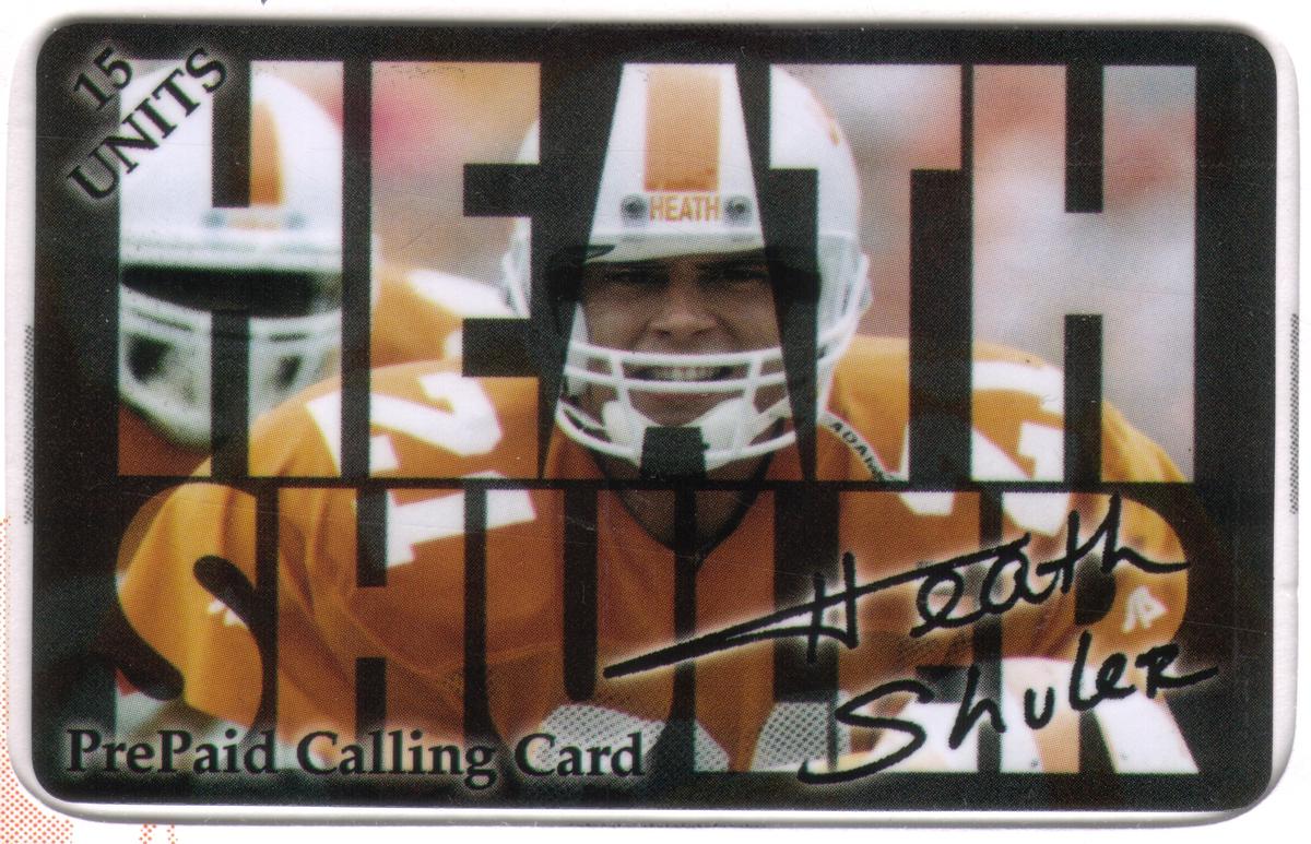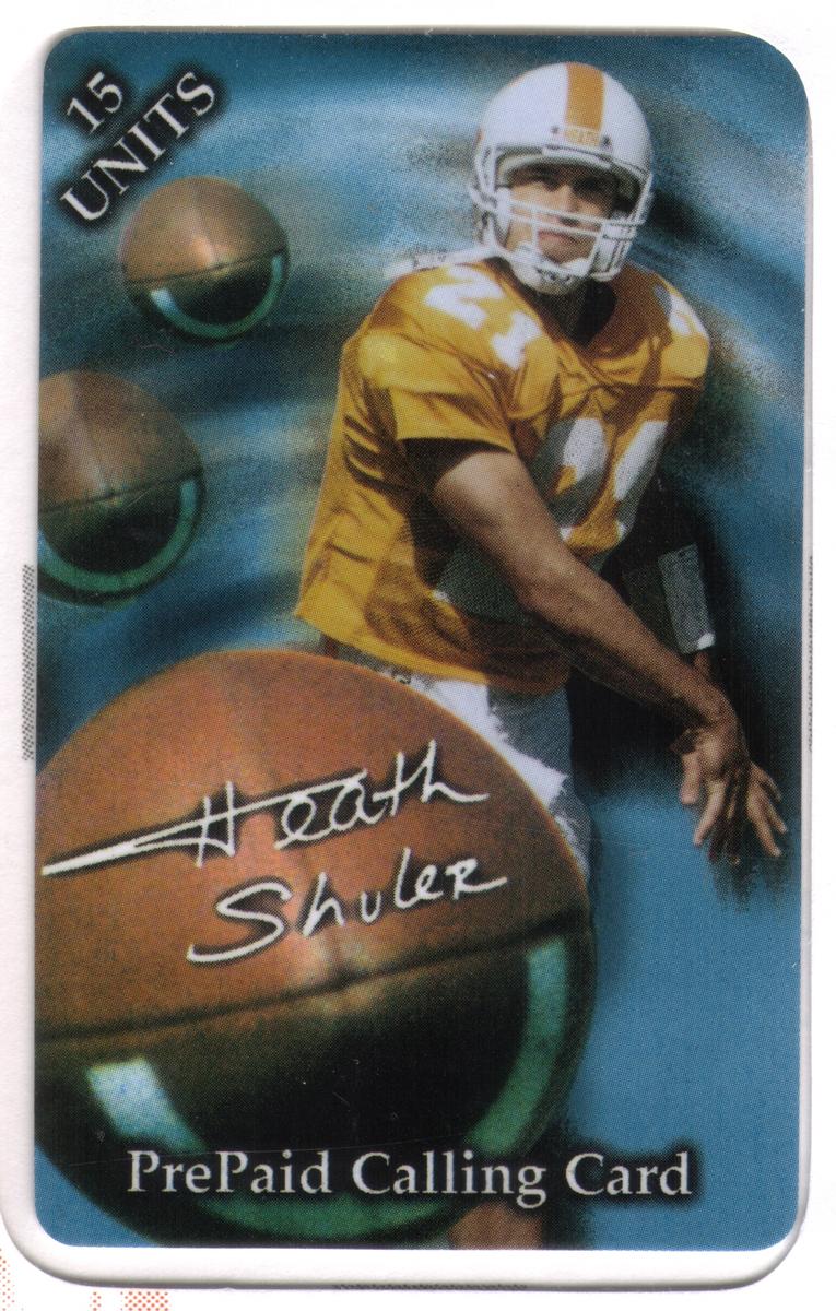 Additionally, the cards feature logos for TeleQuip and WorldCom, indicating corporate partnerships related to telecommunication services. The overall design integrates Heath Shuler’s legacy from college to professional football, with clear text and team insignias presented in a vibrant style. This set celebrates Heath Shuler’s football career through three distinct collectible phone card designs.