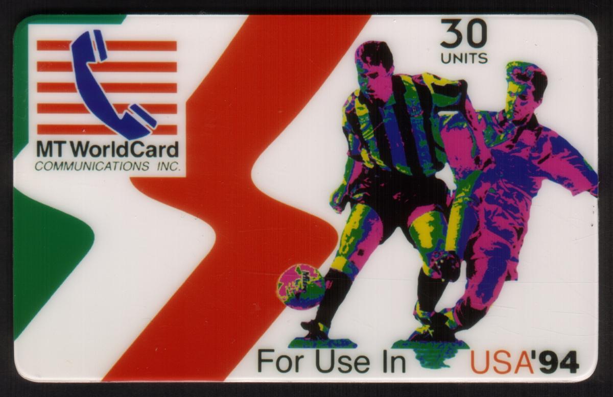 The card bears the name "MT World Card Commun.", indicating the issuing or sponsoring entity. The overall composition focuses on the sport’s excitement and Italy’s participation in the 1994 World Cup soccer competition. The design blends national pride with sports imagery, reflecting the global appeal of the tournament and Italy’s significant role in it.
