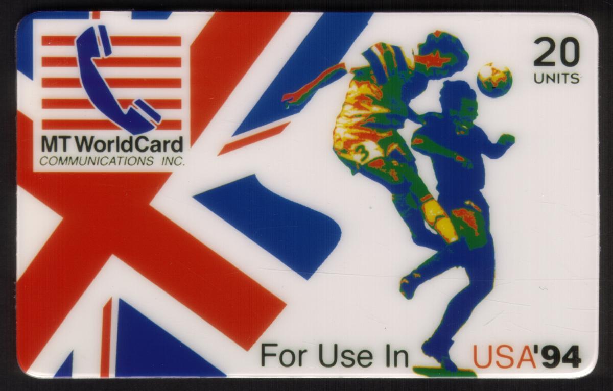 The cards feature the MT WorldCard logo in the upper left corner, which includes an American flag design with a blue telephone icon and the words "MT WorldCard COMMUNICATIONS INC." beneath it. The soccer players on each card are shown engaging with a colorful patterned soccer ball, emphasizing the sport as the central theme. The player illustrations are stylized with contrasting colors to create a striking visual effect, highlighting key actions such as kicking, heading, tackling, and goalkeeping.