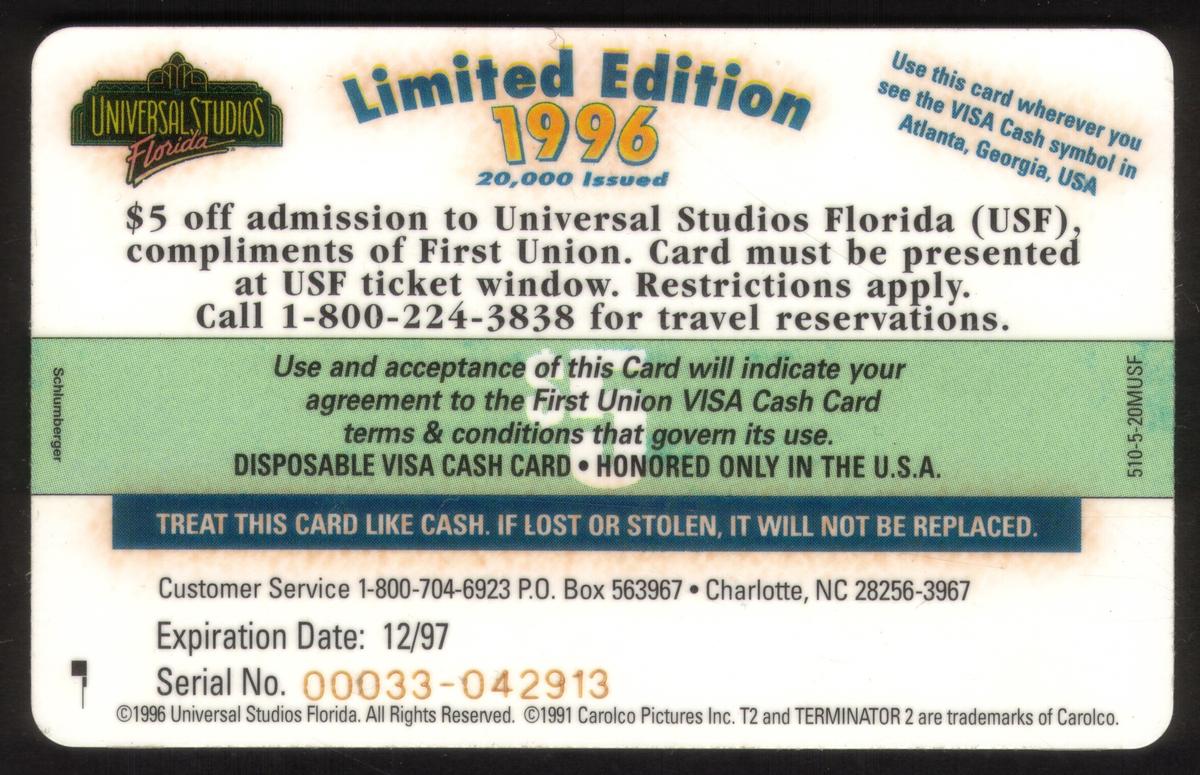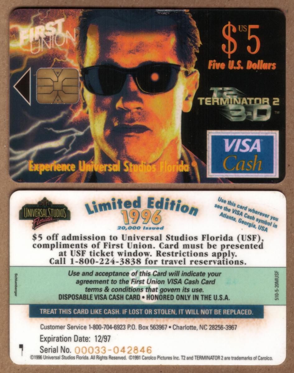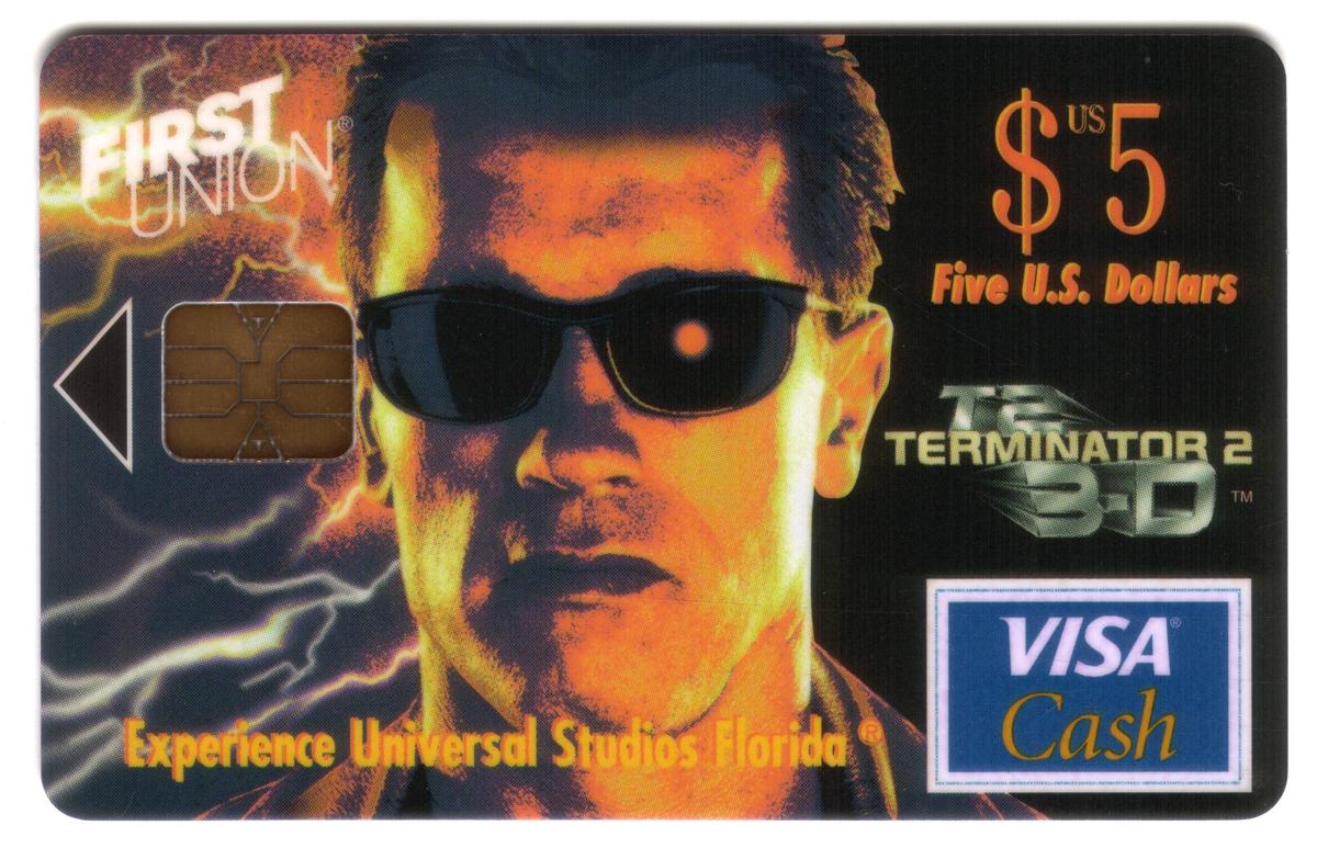 The card clearly ties into the 1996 film "Terminator 2" and the related Universal Studios Florida attraction, combining promotional and functional aspects as a Visa Cash bank card.