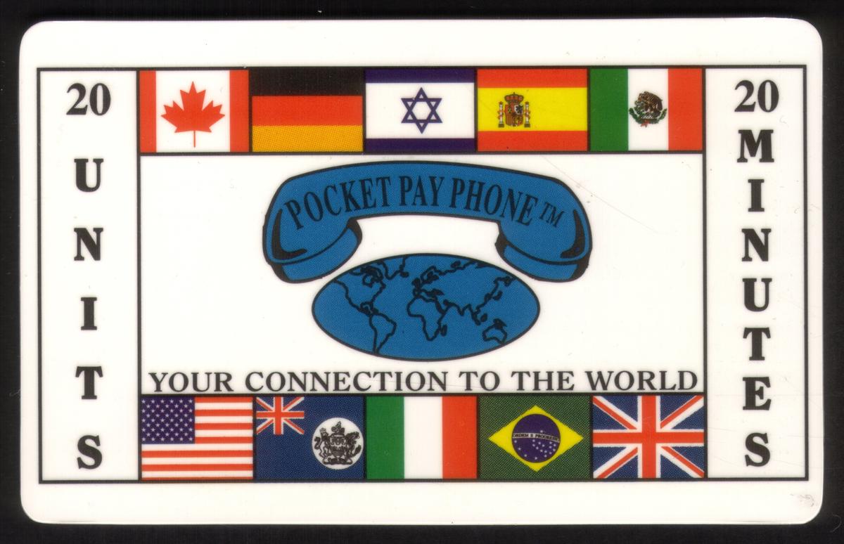 This collectible phone card features a photographic image of a Pocket Pay Phone against a clear, blue sky background. The phone is prominently shown in the center of the card, designed for public use. Above the phone, the text reads: "Your Connection To The World" in quotes, emphasizing international communication. Surrounding this phrase are several national flags, including the Canadian flag, the Israeli flag, and the American flag, symbolizing global connectivity.