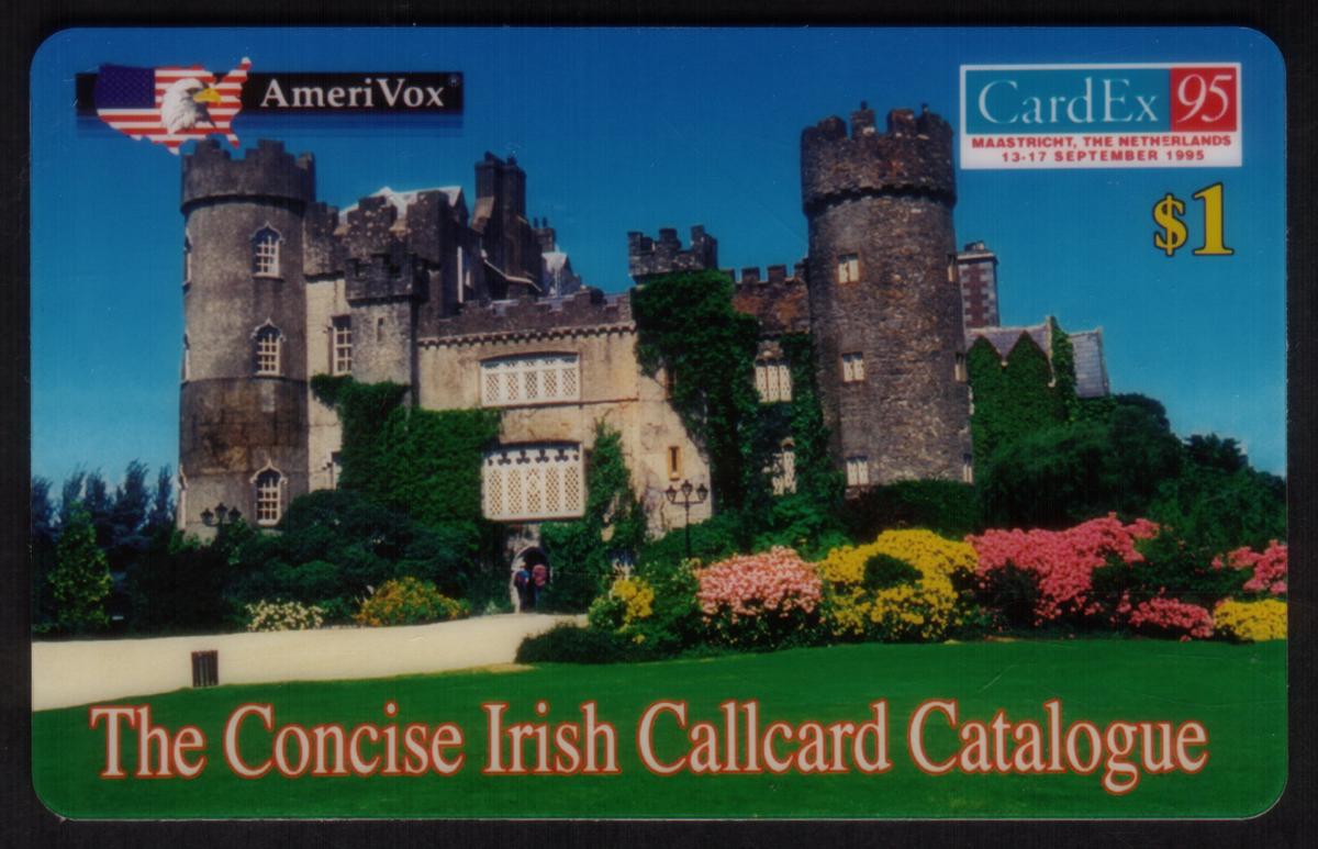 The card is associated with CardEx '95, the third annual concise Irish callcard catalog event. The text on the card includes references to Telecard Events, expos held in the Netherlands (Holland), and the concise Irish callcard catalog. The AmeriVox label is also present on the card, indicating the issuer or related entity connected to this collectible item.