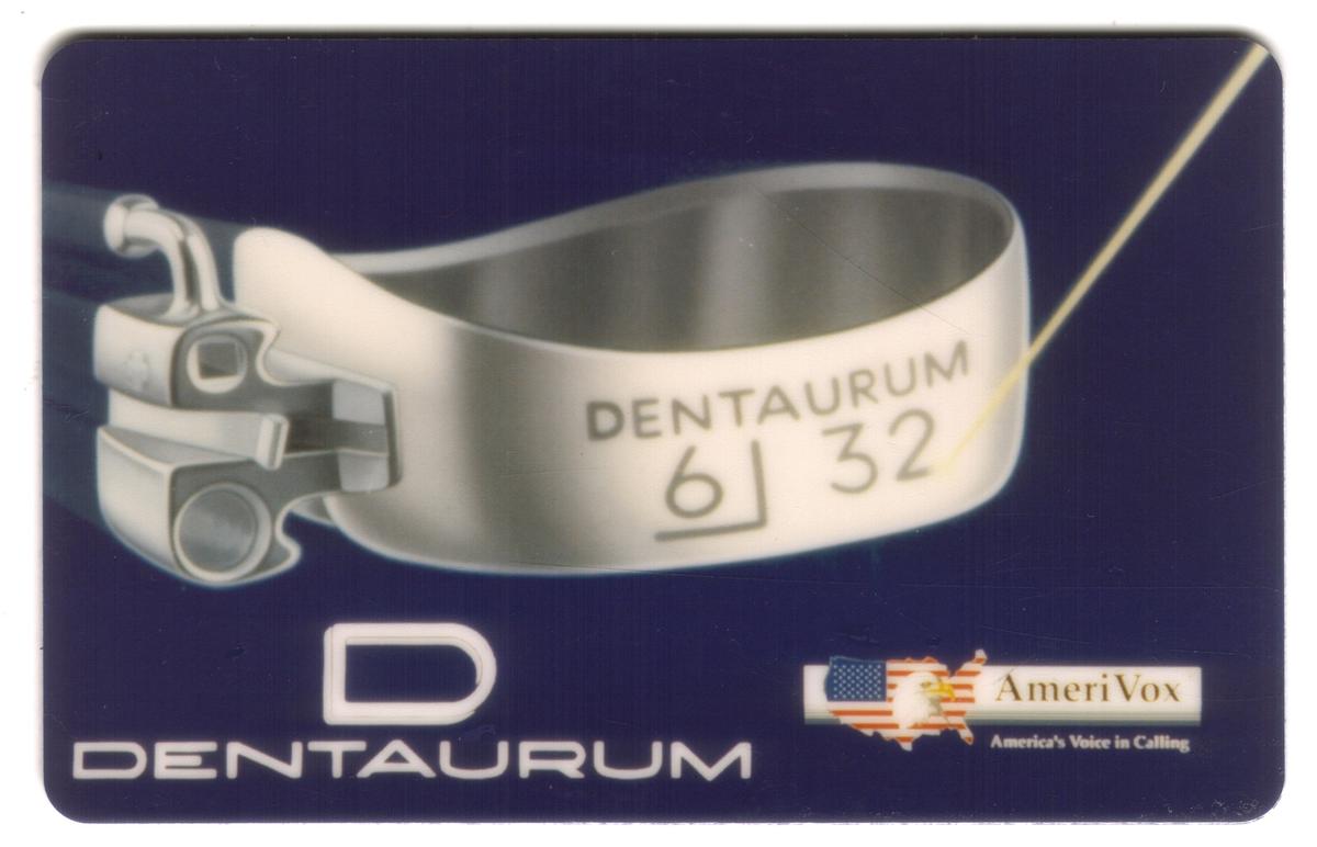 The card’s layout includes precise typographic elements arranged to highlight the dental industry focus, particularly orthodontics and implants. "Dentaurum" is positioned prominently, underscoring its significance as a manufacturer or supplier of dental fittings. The term "dentistry" appears clearly, reinforcing the theme and framing the card within the medical and dental field. "AmeriVox" is displayed as the issuing phone card network, commonly used in collectible phone cards from the 1990s.