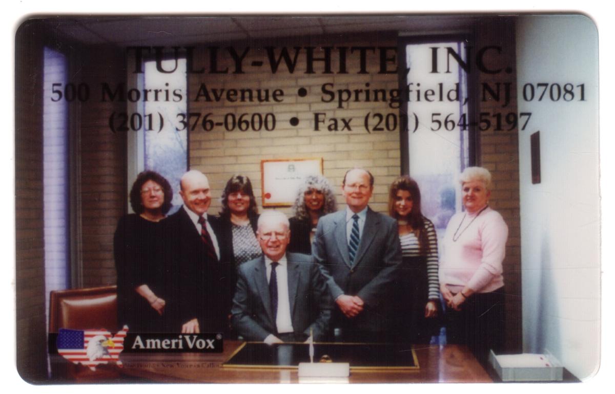 This collectible card features a group photograph of eight people identified as employees, executives, managers, and bosses from Tully-White, Inc., located in Springfield, New Jersey. The individuals are posed standing and seated, all dressed in professional business attire, reflecting a formal corporate setting. The group includes men and women of various ages, positioned in two rows; the front row is seated while the back row stands behind them.
