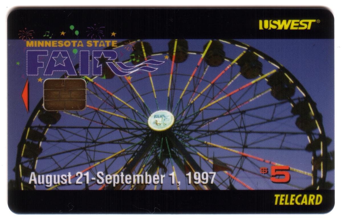 Text on the card identifies it as associated with U.S. West Communications and references its status as a service stored value card. The imagery and text emphasize the card’s connection to Midwestern entertainment and cultural events, making it a collectible item that celebrates the Minnesota State Fair and its vibrant Ferris wheel attraction from 1997.