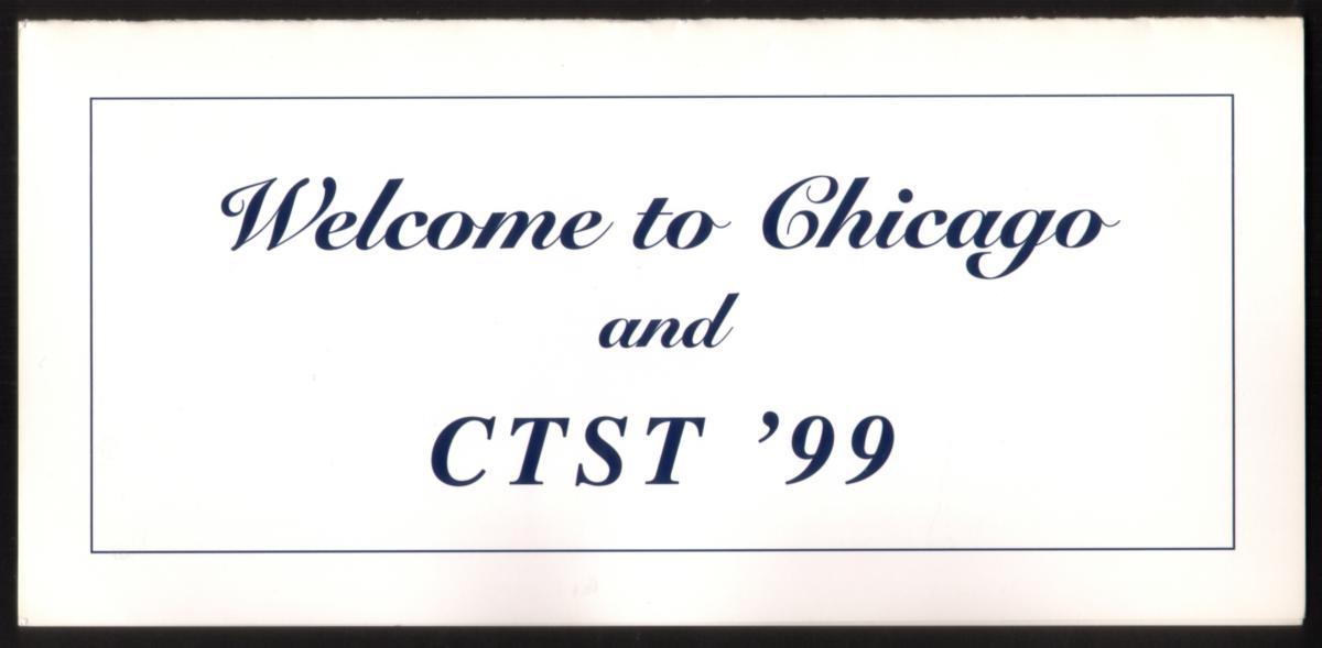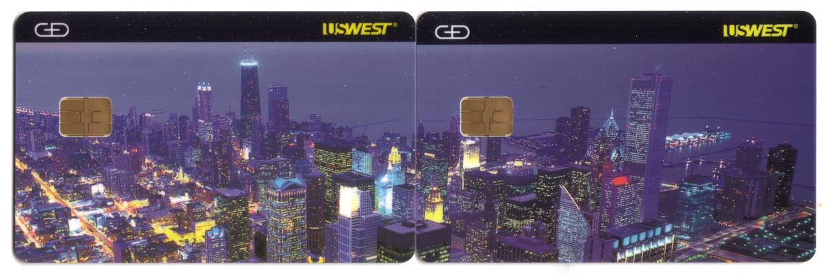 The set comprises two cards, presented side by side, making a panoramic puzzle effect of the Chicago skyline when displayed together. The cards are connected visually through the continuous cityscape image, enhancing their collectible appeal. Keywords associated with these cards include g&d chip card, US West, svc, stored value, CardTech SecureTech, smart cards, and Welcome To Chicago & CTST 1999 Skyline Puzzle Set of 2 in Folder - U.S. West Communications.