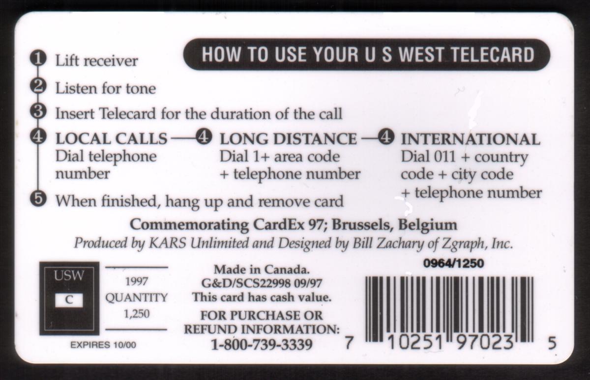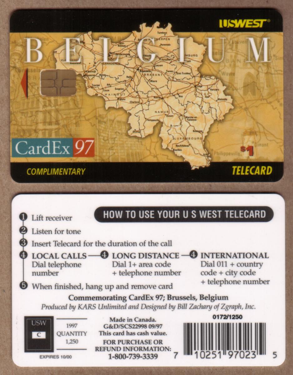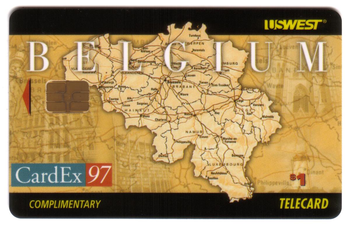 This card is a promotional stored value smart card associated with the CardEx 1997 event, representing Belgium with collectible appeal. It is a sealed, complimentary show card issued by U.S. West Communications.