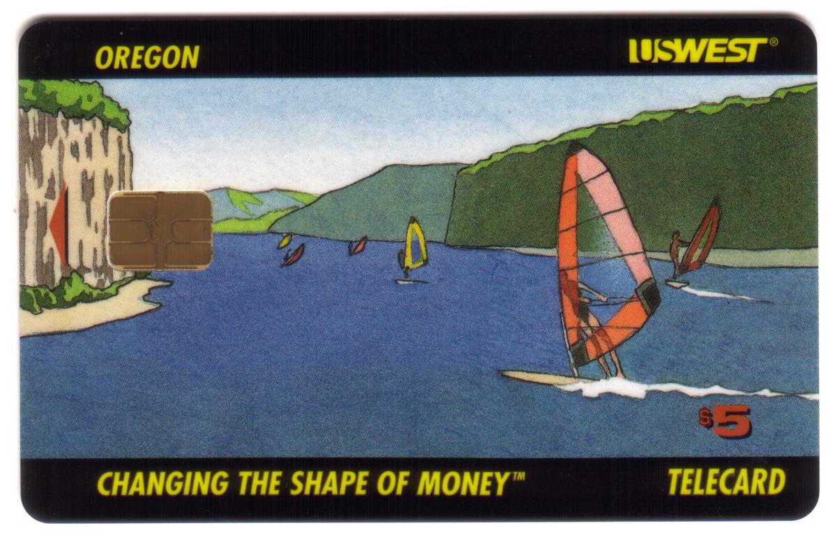 This is a stored value smart card issued by U.S. West Communications, known for integrating technology with collectible artwork. The card belongs to the series titled "Changing The Shape of Money: Oregon (2nd Printing)" and is marked as #4 of 5 in the windsurfing sports collection. The front of the card includes the U.S. West and G&D logos, both prominently placed, confirming its authenticity and origin.