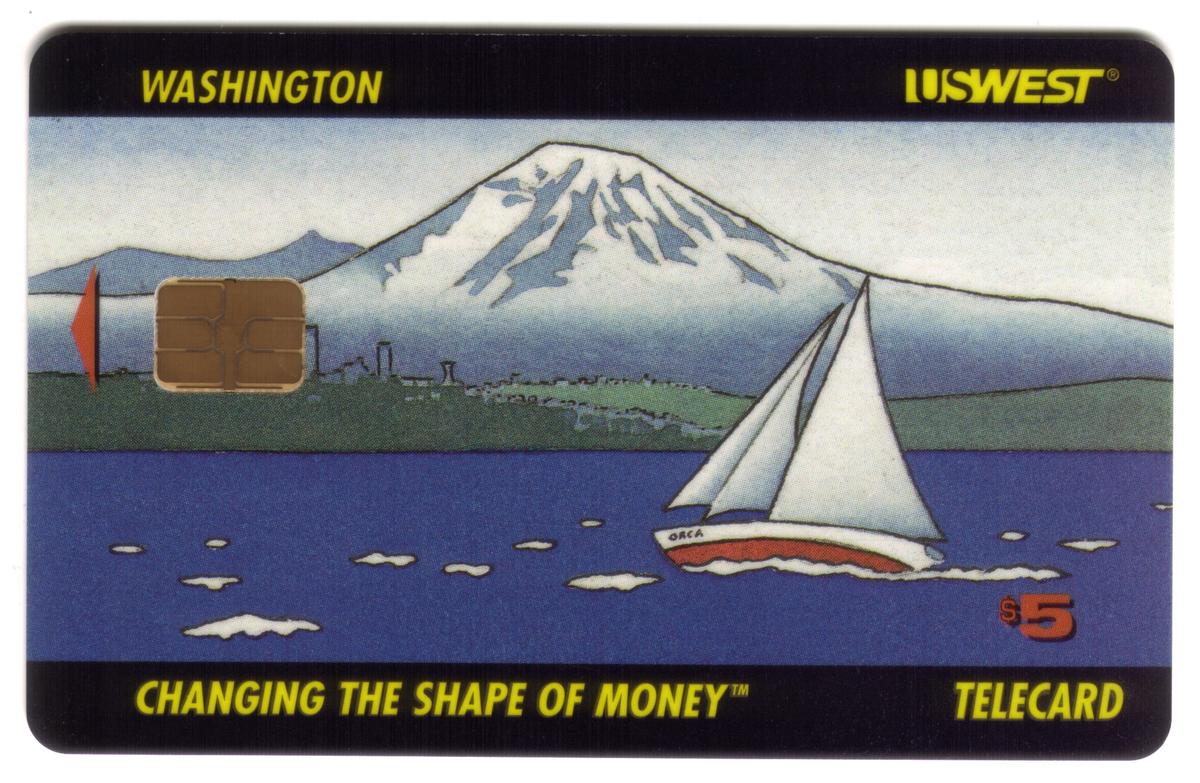 The card is associated with U.S. West Communications and bears the title "Changing The Shape of Money: Washington State 2nd Ptg Sailboat #5/5," indicating it is part of a limited series focused on Washington State and sailing imagery. The card is a smart card with a chip embedded for stored value use. The design integrates both practical functionality and artistic expression, reflecting a blend of utility and visual appeal.