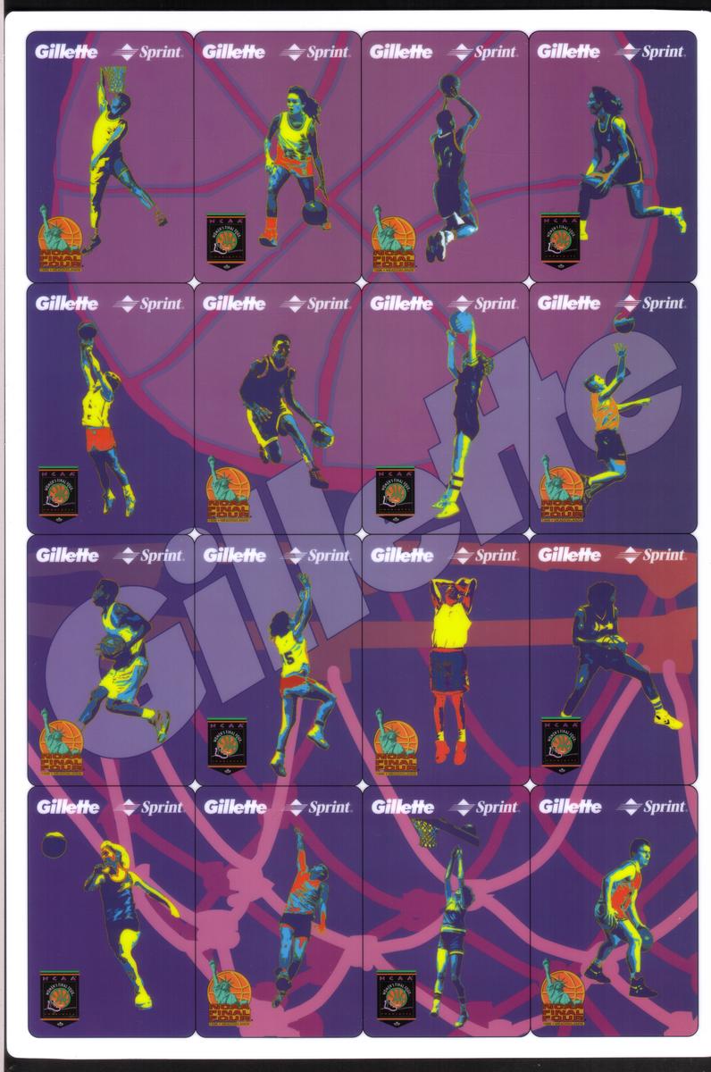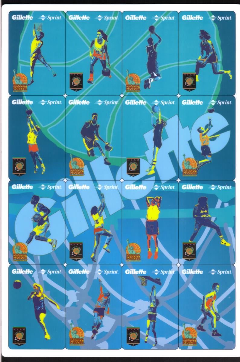 The design incorporates iconic American symbols, including the Statue of Liberty, highlighting Americana and national monuments. The color scheme includes prominent blue and purple hues, reflecting the Gillette Series 2 color branding. The sheets appear promotional in nature and were released for Sprint. They blend elements of sports and American cultural icons, celebrating both basketball and key national emblems.
