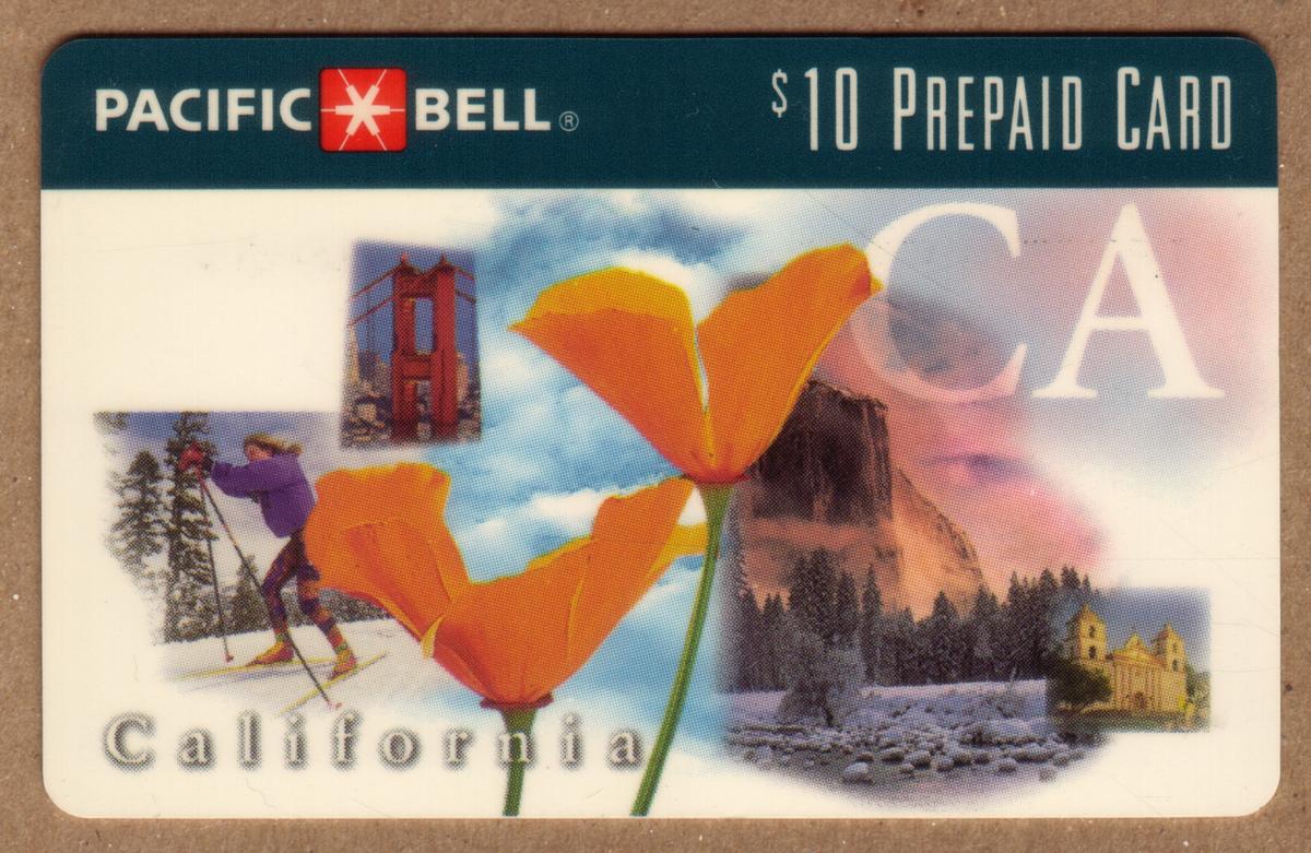 California themed $10 prepaid card featuring Golden Gate Bridge, California Poppies, Yosemite Half Dome, a skier, and historic mission landmarks. |
